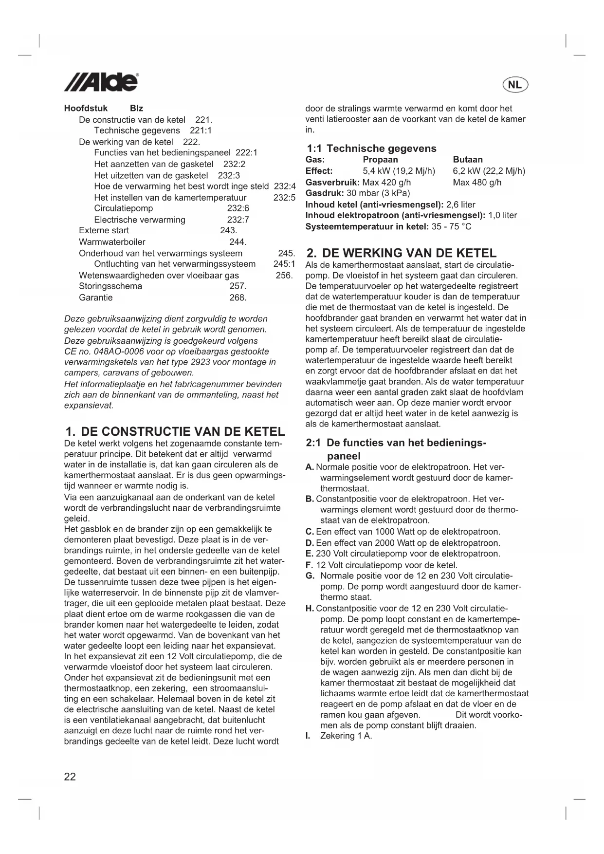 Hoofdstuk Blz De constructie van de ketel 221. Technische gegevens 221:1 De werking van de ketel 222. Functies van het bedieningspaneel 222:1 Het aanzetten van de gasketel 232:2 Het uitzetten van de gasketel 232:3 Hoe de verwarming het best wordt inge steld 232:4 Het instellen van de kamertemperatuur 232:5 Circulatiepomp 232:6 Electrische verwarming 232:7 Externe start 243. Warmwaterboiler 244. Onderhoud van het verwarmings systeem 245. Ontluchting van het verwarmingssysteem 245:1 Wetenswaardigheden over vloeibaar gas 256. Storingsschema 257. Garantie 268. Deze gebruiksaanwijzing dient zorgvuldig te worden gelezen voordat de ketel in gebruik wordt genomen. Deze gebruiksaanwijzing is goedgekeurd volgens CE no. 048AO-0006 voor op vloeibaargas gestookte verwarmingsketels van het type 2923 voor montage in campers, caravans of gebouwen. Het informatieplaatje en het fabricagenummer bevinden zich aan de binnenkant van de ommanteling, naast het expansievat. DE CONSTRUCTIE VAN DE KETEL1. De ketel werkt volgens het zogenaamde constante tem- peratuur principe. Dit betekent dat er altijd verwarmd water in de installatie is, dat kan gaan circuleren als de kamerthermostaat aanslaat. Er is dus geen opwarmings- tijd wanneer er warmte nodig is. Via een aanzuigkanaal aan de onderkant van de ketel wordt de verbrandingslucht naar de verbrandingsruimte geleid. Het gasblok en de brander zijn op een gemakkelijk te demonteren plaat bevestigd. Deze plaat is in de ver- brandings ruimte, in het onderste gedeelte van de ketel gemonteerd. Boven de verbrandingsruimte zit het water- gedeelte, dat bestaat uit een binnen- en een buitenpijp. De tussenruimte tussen deze twee pijpen is het eigen- lijke waterreservoir. In de binnenste pijp zit de vlamver- trager, die uit een geplooide metalen plaat bestaat. Deze plaat dient ertoe om de warme rookgassen die van de brander komen naar het watergedeelte te leiden, zodat het water wordt opgewarmd. Van de bovenkant van het water gedeelte loopt een leiding naar het expansievat. In het expansievat zit een 12 Volt circulatiepomp, die de verwarmde vloeistof door het systeem laat circuleren. Onder het expansievat zit de bedieningsunit met een thermostaatknop, een zekering, een stroomaanslui- ting en een schakelaar. Helemaal boven in de ketel zit de electrische aansluiting van de ketel. Naast de ketel is een ventilatiekanaal aangebracht, dat buitenlucht aanzuigt en deze lucht naar de ruimte rond het ver- brandings gedeelte van de ketel leidt. Deze lucht wordt door de stralings warmte verwarmd en komt door het venti latierooster aan de voorkant van de ketel de kamer in. Technische gegevens1:1 Gas: Propaan Butaan Effect: 5,4 kW (19,2 Mj/h) 6,2 kW (22,2 Mj/h) Gasverbruik: Max 420 g/h Max 480 g/h Gasdruk: 30 mbar (3 kPa) Inhoud ketel (anti-vriesmengsel): 2,6 liter Inhoud elektropatroon (anti-vriesmengsel): 1,0 liter Systeemtemperatuur in ketel: 35 - 75 °C DE WERKING VAN DE KETEL2. Als de kamerthermostaat aanslaat, start de circulatie- pomp. De vloeistof in het systeem gaat dan circuleren. De temperatuurvoeler op het watergedeelte registreert dat de watertemperatuur kouder is dan de temperatuur die met de thermostaat van de ketel is ingesteld. De hoofdbrander gaat branden en verwarmt het water dat in het systeem circuleert. Als de temperatuur de ingestelde kamertemperatuur heeft bereikt slaat de circulatie- pomp af. De temperatuurvoeler registreert dan dat de watertemperatuur de ingestelde waarde heeft bereikt en zorgt ervoor dat de hoofdbrander afslaat en dat het waakvlammetje gaat branden. Als de water temperatuur daarna weer een aantal graden zakt slaat de hoofdvlam automatisch weer aan. Op deze manier wordt ervoor gezorgd dat er altijd heet water in de ketel aanwezig is als de kamerthermostaat aanslaat. De functies van het bedie nings - 2:1 paneel Normale positie voor de elektropatroon. Het ver-A. warmingselement wordt gestuurd door de kamer- thermostaat. Constantpositie voor de elektropatroon. Het ver-B. warmings element wordt gestuurd door de thermo- staat van de elektropatroon. Een effect van 1000 Watt op de elektropatroon.C. Een effect van 2000 Watt op de elektropatroon. D. 230 Volt circulatiepomp voor de elektropatroon.E. 12 Volt circulatiepomp voor de ketel.F. Normale positie voor de 12 en 230 Volt circulatie-G. pomp. De pomp wordt aangestuurd door de kamer- thermo staat. Constantpositie voor de 12 en 230 Volt circulatie-H. pomp. De pomp loopt constant en de kamertempe- ratuur wordt geregeld met de thermostaatknop van de ketel, aangezien de systeemtemperatuur van de ketel kan worden in gesteld. De constantpositie kan bijv. worden gebruikt als er meerdere personen in de wagen aanwezig zijn. Als men dan dicht bij de kamer thermostaat zit bestaat de mogelijkheid dat lichaams warmte ertoe leidt dat de kamerthermostaat reageert en de pomp afslaat en dat de vloer en de ramen kou gaan afgeven. Dit wordt voorko- men als de pomp constant blijft draaien. Zekering 1 A.I. NL23