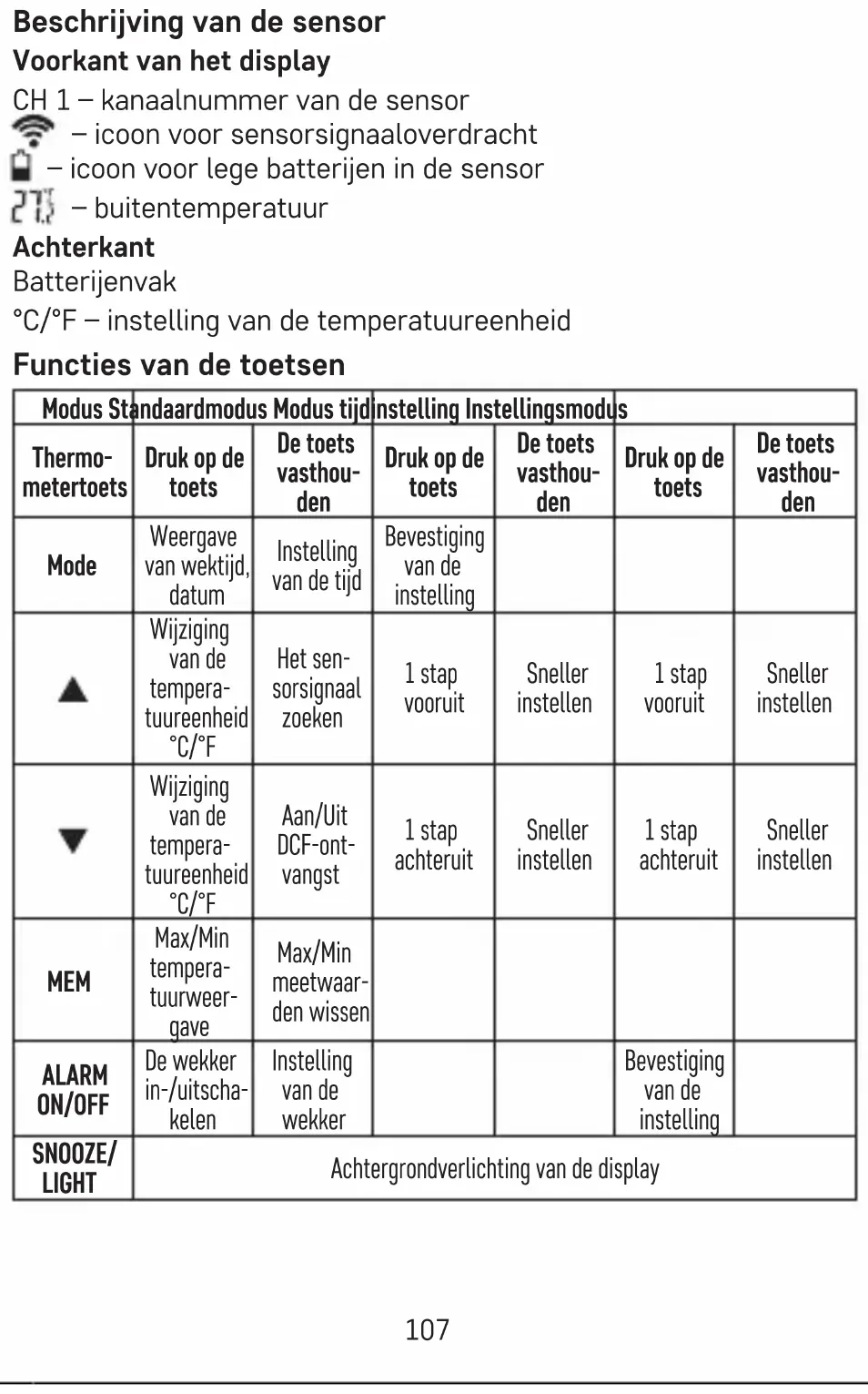 4 – sluimer-icoon (snooze) 5 – wekker-icoon 6 – DCF-signaalicoon 7 – buitentemperatuur 8 – binnentemperatuur – zomertijd Achterkant: 9 – batterijvak 10 – toets MODE 11 – pijltje omhoog 12 – pijltje omlaag 13 – MEM107 Beschrijving van de sensor Voorkant van het display CH 1 – kanaalnummer van de sensor – icoon voor sensorsignaaloverdracht – icoon voor lege batterijen in de sensor – buitentemperatuur Achterkant Batterijenvak °C/°F – instelling van de temperatuureenheid Functies van de toetsen Modus Standaardmodus Modus tijdinstelling Instellingsmodus Thermo- metertoets Druk op de toets De toets vasthou- den Druk op de toets De toets vasthou- den Druk op de toets De toets vasthou- den Mode Weergave van wektijd, datum Instelling van de tijd Bevestiging van de instelling Wijziging van de tempera- tuureenheid °C/°F Het sen- sorsignaal zoeken 1 stap vooruit Sneller instellen 1 stap vooruit Sneller instellen Wijziging van de tempera- tuureenheid °C/°F Aan/Uit DCF-ont- vangst 1 stap achteruit Sneller instellen 1 stap achteruit Sneller instellen MEM Max/Min tempera- tuurweer- gave Max/Min meetwaar- den wissen ALARM ON/OFF De wekker in-/uitscha- kelen Instelling van de wekker Bevestiging van de instelling SNOOZE/ LIGHT Achtergrondverlichting van de display108 Inbedrijfstelling