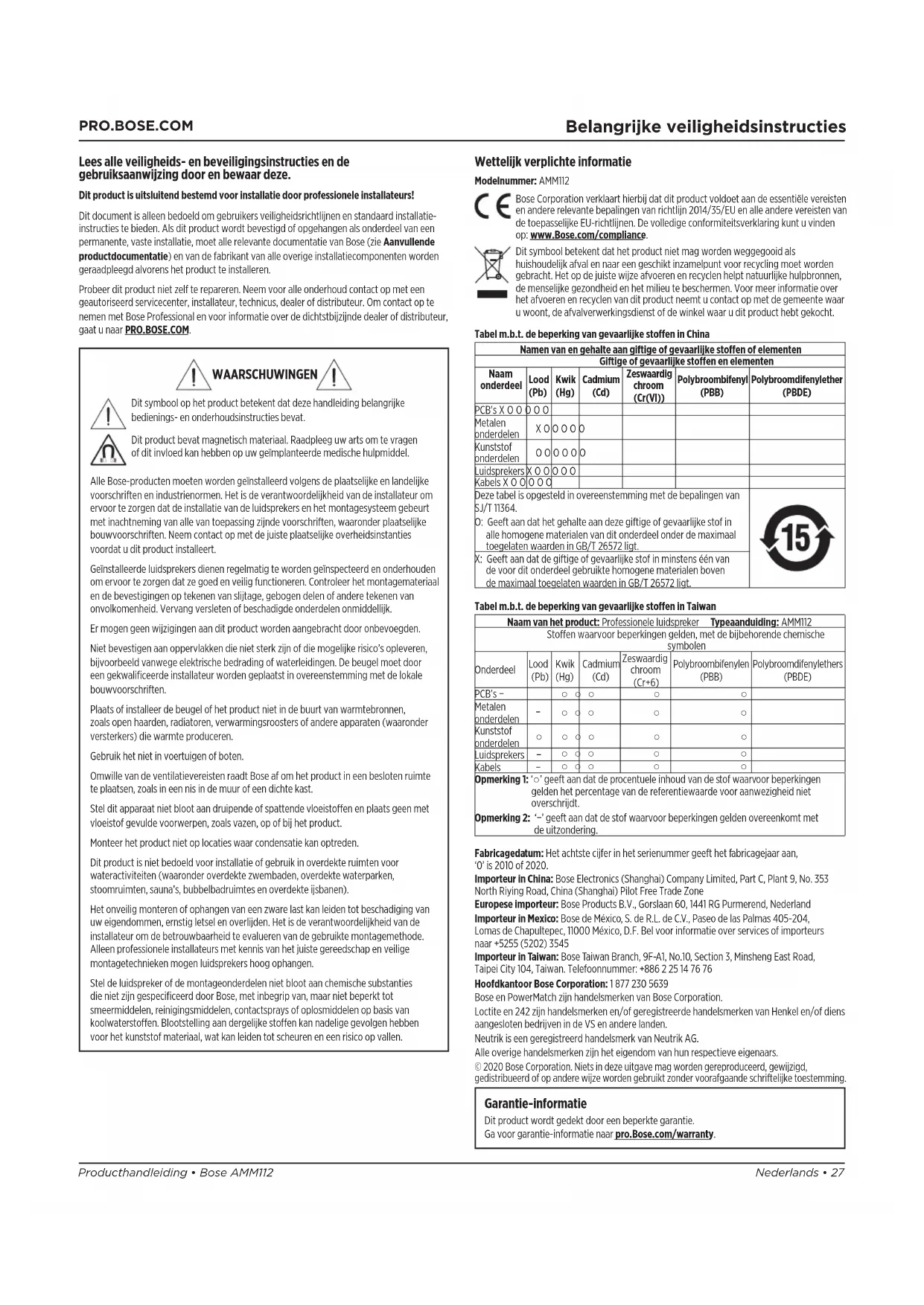Opmerking 1: ‘○’ geeft aan dat de procentuele inhoud van de stof waarvoor beperkingen gelden het percentage van de referentiewaarde voor aanwezigheid niet overschrijdt. Opmerking 2: ‘−’ geeft aan dat de stof waarvoor beperkingen gelden overeenkomt met deuitzondering. Fabricagedatum: Het achtste cijfer in het serienummer geeft het fabricagejaar aan, ‘0’ is 2010 of 2020. Importeur in China: Bose Electronics (Shanghai) Company Limited, Part C, Plant 9, No. 353 North Riying Road, China (Shanghai) Pilot Free Trade Zone Europese importeur: Bose Products B.V., Gorslaan 60, 1441 RG Purmerend, Nederland Importeur in Mexico: Bose de México, S. de R.L. de C.V., Paseo de las Palmas 405-204, Lomas de Chapultepec, 11000 México, D.F. Bel voor informatie over services of importeurs naar +5255 (5202) 3545 Importeur in Taiwan: Bose Taiwan Branch, 9F-A1, No.10, Section 3, Minsheng East Road, Taipei City 104, Taiwan. Telefoonnummer: +886 2 25 14 76 76 Hoofdkantoor Bose Corporation: 1 877 230 5639 Bose en PowerMatch zijn handelsmerken van Bose Corporation. Loctite en 242 zijn handelsmerken en/of geregistreerde handelsmerken van Henkel en/of diens aangesloten bedrijven in de VS en andere landen. Neutrik is een geregistreerd handelsmerk van Neutrik AG. Alle overige handelsmerken zijn het eigendom van hun respectieve eigenaars. © 2020 Bose Corporation. Niets in deze uitgave mag worden gereproduceerd, gewijzigd, gedistribueerd of op andere wijze worden gebruikt zonder voorafgaande schriftelijke toestemming. Garantie-informatie Dit product wordt gedekt door een beperkte garantie. Ga voor garantie-informatie naar pro.Bose.com/warranty. WAARSCHUWINGEN Dit symbool op het product betekent dat deze handleiding belangrijke bedienings- en onderhoudsinstructies bevat. Dit product bevat magnetisch materiaal. Raadpleeg uw arts om te vragen ofdit invloed kan hebben op uw geïmplanteerde medische hulpmiddel. Alle Bose-producten moeten worden geïnstalleerd volgens de plaatselijke en landelijke voorschriften en industrienormen. Het is de verantwoordelijkheid van de installateur om ervoor te zorgen dat de installatie van de luidsprekers en het montagesysteem gebeurt met inachtneming van alle van toepassing zijnde voorschriften, waaronder plaatselijke bouwvoorschriften. Neem contact op met de juiste plaatselijke overheidsinstanties voordat u dit product installeert. Geïnstalleerde luidsprekers dienen regelmatig te worden geïnspecteerd en onderhouden om ervoor te zorgen dat ze goed en veilig functioneren. Controleer het montagemateriaal en de bevestigingen op tekenen van slijtage, gebogen delen of andere tekenen van onvolkomenheid. Vervang versleten of beschadigde onderdelen onmiddellijk. Er mogen geen wijzigingen aan dit product worden aangebracht door onbevoegden. Niet bevestigen aan oppervlakken die niet sterk zijn of die mogelijke risico’s opleveren, bijvoorbeeld vanwege elektrische bedrading of waterleidingen. De beugel moet door een gekwalificeerde installateur worden geplaatst in overeenstemming met de lokale bouwvoorschriften. Plaats of installeer de beugel of het product niet in de buurt van warmtebronnen, zoals open haarden, radiatoren, verwarmingsroosters of andere apparaten (waaronder versterkers) die warmte produceren. Gebruik het niet in voertuigen of boten. Omwille van de ventilatievereisten raadt Bose af om het product in een besloten ruimte te plaatsen, zoals in een nis in de muur of een dichte kast. Stel dit apparaat niet bloot aan druipende of spattende vloeistoen en plaats geen met vloeistof gevulde voorwerpen, zoals vazen, op of bij het product. Monteer het product niet op locaties waar condensatie kan optreden. Dit product is niet bedoeld voor installatie of gebruik in overdekte ruimten voor wateractiviteiten (waaronder overdekte zwembaden, overdekte waterparken, stoomruimten, sauna’s, bubbelbadruimtes en overdekte ijsbanen). Het onveilig monteren of ophangen van een zware last kan leiden tot beschadiging van uw eigendommen, ernstig letsel en overlijden. Het is de verantwoordelijkheid van de installateur om de betrouwbaarheid te evalueren van de gebruikte montagemethode. Alleen professionele installateurs met kennis van het juiste gereedschap en veilige montagetechnieken mogen luidsprekers hoog ophangen. Stel de luidspreker of de montageonderdelen niet bloot aan chemische substanties die niet zijn gespecificeerd door Bose, met inbegrip van, maar niet beperkt tot smeermiddelen, reinigingsmiddelen, contactsprays of oplosmiddelen op basis van koolwaterstoen. Blootstelling aan dergelijke stoen kan nadelige gevolgen hebben voorhet kunststof materiaal, wat kan leiden tot scheuren en een risico op vallen.28 • Nederlands Bose AMM112 • Producthandleiding