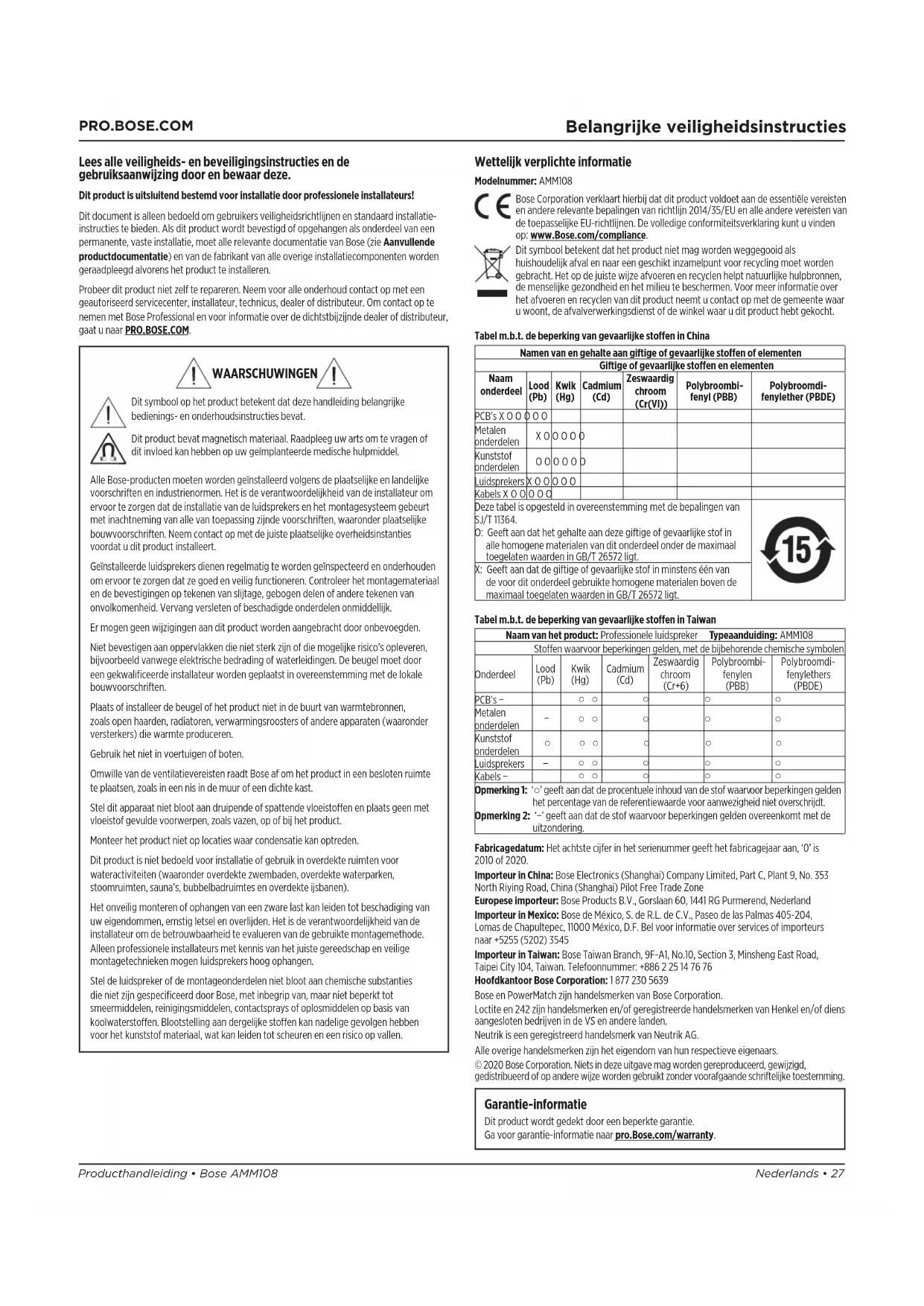Dit document is alleen bedoeld om gebruikers veiligheidsrichtijnen en standard installation instructions te bieden. Als dit product wordt bevestigd of opgehangen als onderdeel van een permanente, vae installmentatie, moet alle relevante documentatione van Bose (zie Aanvullende productdocumentatie) en van de fabrikant van alle overige installmentecomponenten worden geraadpleegd alvorens het product te installereren.