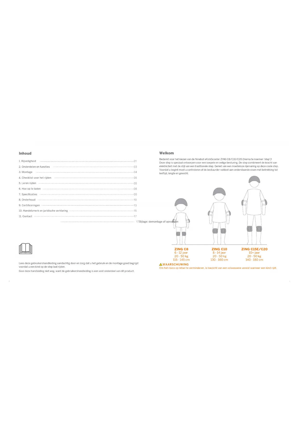 17Bijlage: demontage of opvouwen WAARSCHUWING Om het risico op letsel te verminderen, is toezicht van een volwassene vereist wanneer een kind rijdt. Bedankt voor het kiezen van de Ninebot eKickScooter ZING C8/C10/C20 (hierna te noemen ‘step’)! Deze step is speciaal ontworpen voor een soepele en veilige besturing. De step combineert de kracht van elektriciteit met de stijl van een traditionele step. Geniet van een moeiteloze rijervaring op deze coole step. Voordat u begint moet u controleren of de bestuurder voldoet aan onderstaande eisen met betrekking tot leeftijd, lengte en gewicht. ZING C8