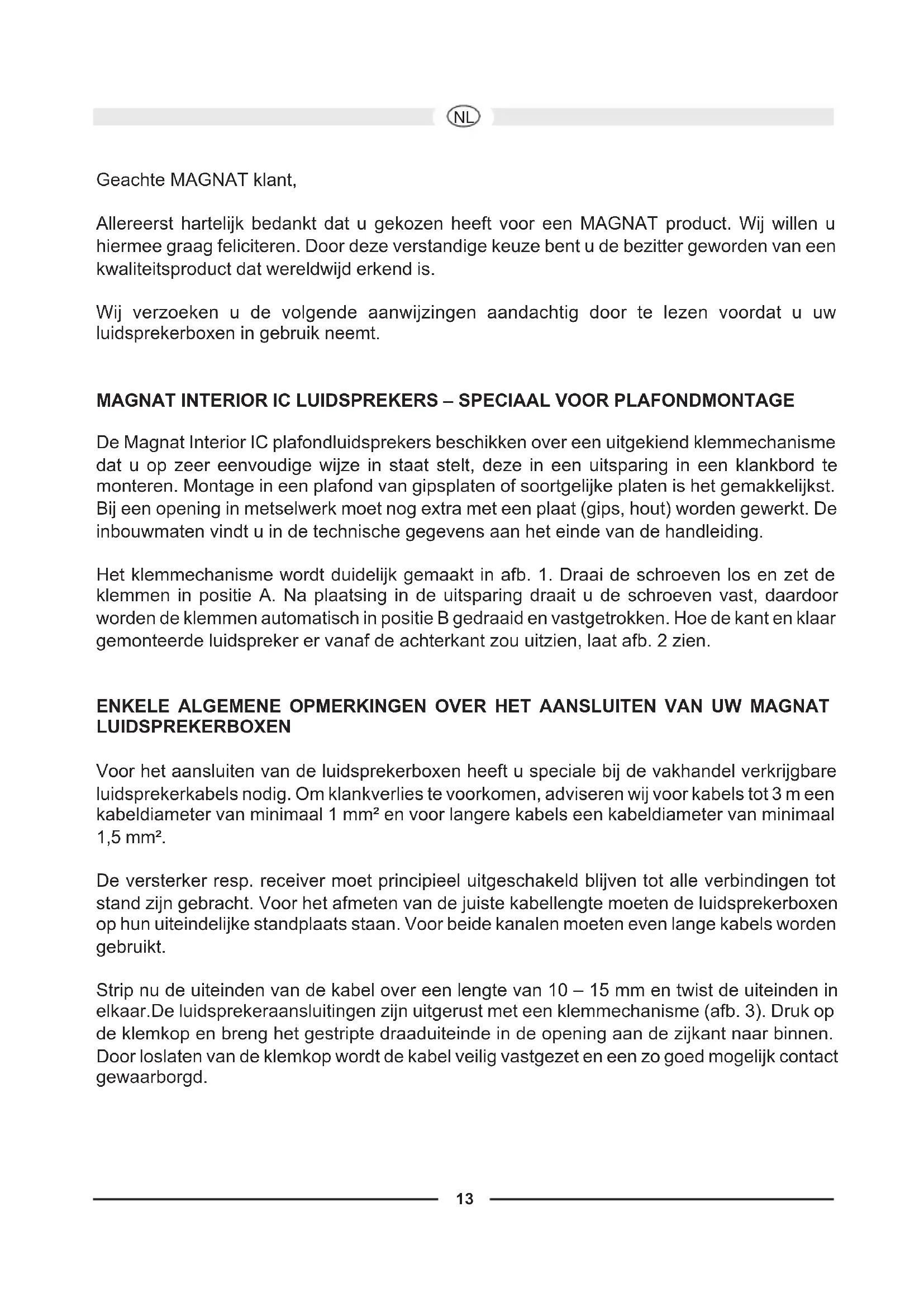 Geachte MAGNAT klant, Allereerst hartelijk bedankt dat u gekozen heeft voor een MAGNAT product. Wij willen u hiermee graag feliciteren. Door deze verstandige keuze bent u de bezitter geworden van een kwaliteitsproduct dat wereldwijd erkend is. Wij verzoeken u de volgende aanwijzingen aandachtig door te lezen voordat u uw luidsprekerboxen in gebruik neemt. MAGNAT INTERIOR IC LUIDSPREKERS – SPECIAAL VOOR PLAFONDMONTAGE De Magnat Interior IC plafondluidsprekers beschikken over een uitgekiend klemmechanisme dat u op zeer eenvoudige wijze in staat stelt, deze in een uitsparing in een klankbord te monteren. Montage in een plafond van gipsplaten of soortgelijke platen is het gemakkelijkst. Bij een opening in metselwerk moet nog extra met een plaat (gips, hout) worden gewerkt. De inbouwmaten vindt u in de technische gegevens aan het einde van de handleiding. Het klemmechanisme wordt duidelijk gemaakt in afb. 1. Draai de schroeven los en zet de klemmen in positie A. Na plaatsing in de uitsparing draait u de schroeven vast, daardoor worden de klemmen automatisch in positie B gedraaid en vastgetrokken. Hoe de kant en klaar gemonteerde luidspreker er vanaf de achterkant zou uitzien, laat afb. 2 zien. ENKELE ALGEMENE OPMERKINGEN OVER HET AANSLUITEN VAN UW MAGNAT LUIDSPREKERBOXEN Voor het aansluiten van de luidsprekerboxen heeft u speciale bij de vakhandel verkrijgbare luidsprekerkabels nodig. Om klankverlies te voorkomen, adviseren wij voor kabels tot 3 m een kabeldiameter van minimaal 1 mm² en voor langere kabels een kabeldiameter van minimaal 1,5 mm². De versterker resp. receiver moet principieel uitgeschakeld blijven tot alle verbindingen tot stand zijn gebracht. Voor het afmeten van de juiste kabellengte moeten de luidsprekerboxen op hun uiteindelijke standplaats staan. Voor beide kanalen moeten even lange kabels worden gebruikt. Strip nu de uiteinden van de kabel over een lengte van 10 – 15 mm en twist de uiteinden in elkaar.De luidsprekeraansluitingen zijn uitgerust met een klemmechanisme (afb. 3). Druk op de klemkop en breng het gestripte draaduiteinde in de opening aan de zijkant naar binnen. Door loslaten van de klemkop wordt de kabel veilig vastgezet en een zo goed mogelijk contact gewaarborgd.14
