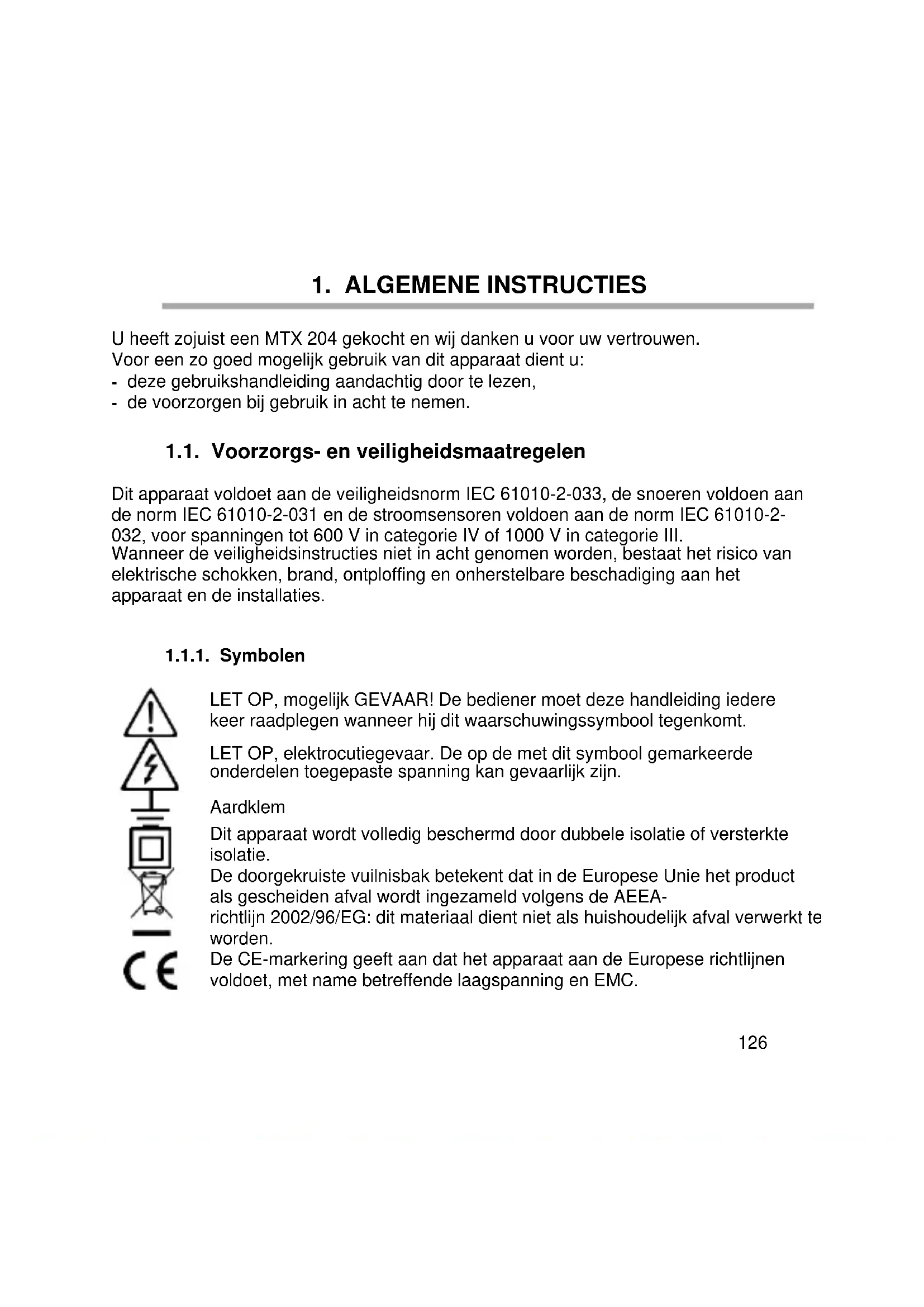 U heeft zojuist een MTX 204 gekocht en wij danken u voor uw vertrouwen. Voor een zo goed mogelijk gebruik van dit apparaat dient u: - deze gebruikshandleiding aandachtig door te lezen, - de voorzorgen bij gebruik in acht te nemen. 1.1. Voorzorgs- en veiligheidsmaatregelen Dit apparaat voldoet aan de veiligheidsnorm IEC 61010-2-033, de snoeren voldoen aan de norm IEC 61010-2-031 en de stroomsensoren voldoen aan de norm IEC 61010-2- 032, voor spanningen tot 600 V in categorie IV of 1000 V in categorie III. Wanneer de veiligheidsinstructies niet in acht genomen worden, bestaat het risico van elektrische schokken, brand, ontploffing en onherstelbare beschadiging aan het apparaat en de installaties.