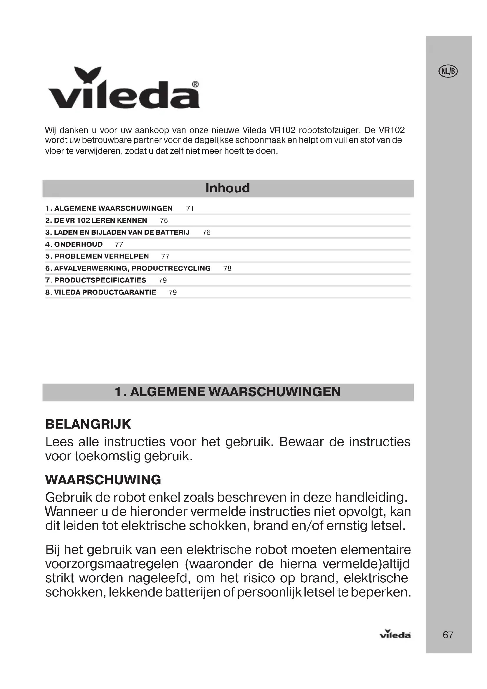 BELANGRIJK Lees alle instructies voor het gebruik. Bewaar de instructies voor toekomstig gebruik. WAARSCHUWING Gebruik de robot enkel zoals beschreven in deze handleiding. Wanneer u de hieronder vermelde instructies niet opvolgt, kan dit leiden tot elektrische schokken, brand en/of ernstig letsel. Bij het gebruik van een elektrische robot moeten elementaire voorzorgsmaatregelen (waaronder de hierna vermelde)altijd strikt worden nageleefd, om het risico op brand, elektrische schokken, lekkende batterijen of persoonlijk letsel te beperken. Wij danken u voor uw aankoop van onze nieuwe Vileda VR102 robotstofzuiger. De VR102 wordt uw betrouwbare partner voor de dagelijkse schoonmaak en helpt om vuil en stof van de vloer te verwijderen, zodat u dat zelf niet meer hoeft te doen. Inhoud 1. ALGEMENE WAARSCHUWINGEN 712. DE VR 102 LEREN KENNEN 753. LADEN EN BIJLADEN VAN DE BATTERIJ 764. ONDERHOUD 775. PROBLEMEN VERHELPEN 776. AFVALVERWERKING, PRODUCTRECYCLING 787. PRODUCTSPECIFICATIES 798. VILEDA PRODUCTGARANTIE 7968