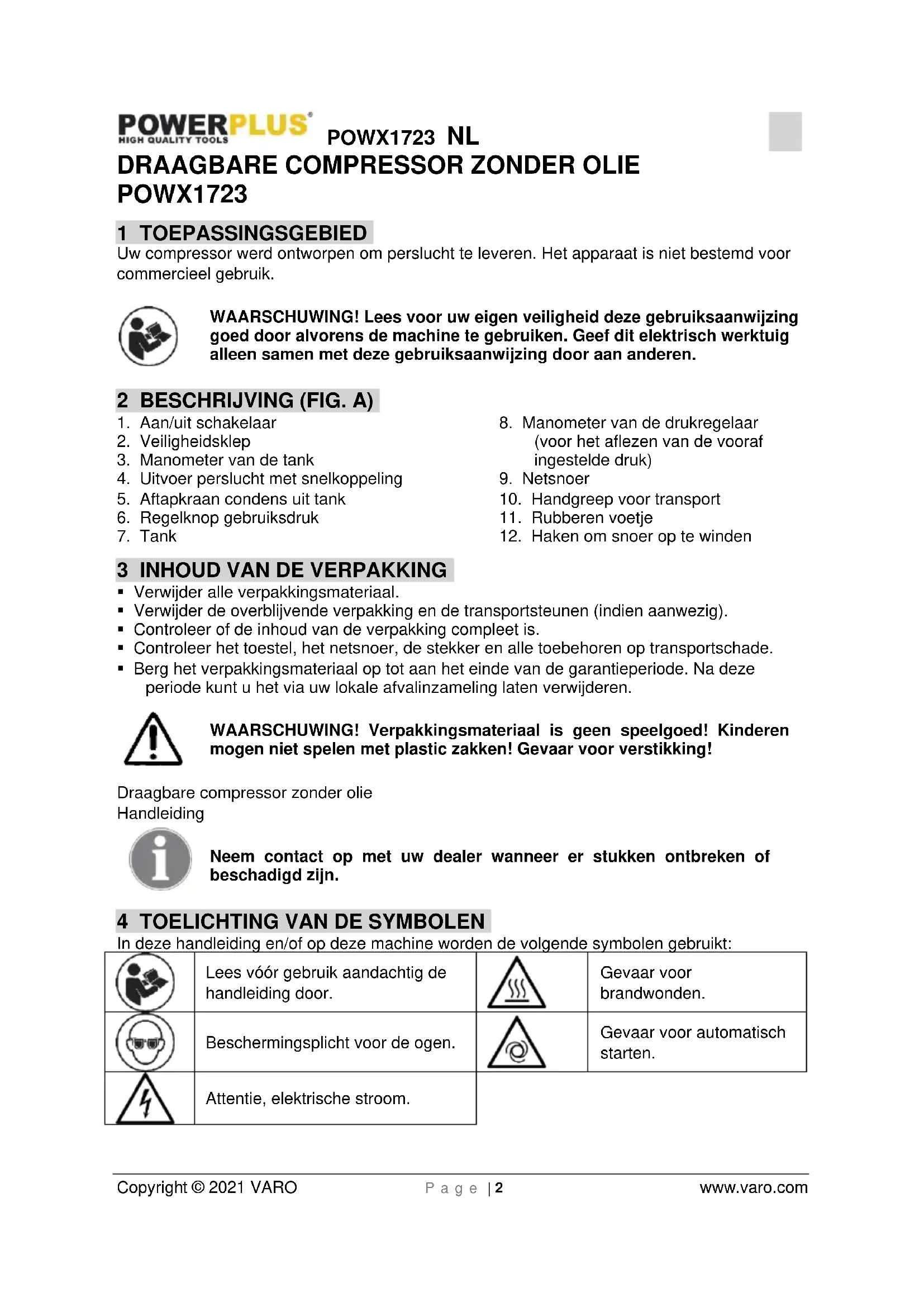 Laat uw apparaat uitsluitend door gekwalificeerde vaklui en met originele reserveonderdelen herstellen. Zo bent u zeker dat de veiligheid van het apparaat behouden blijft.POWX1723 NL Copyright © 2021 VARO P a g e | 5 www.varo.com 6 BIJZONDERE VEILIGHEIDSVOORSCHRIFTEN Dit symbool geeft de waarschuwingen aan die aandachtig gelezen moeten worden alvorens het product te gebruiken, teneinde mogelijk letsel van de gebruiker te voorkomen. Perslucht is een potentieel gevaarlijke vorm van energie. Het is dan ook nodig om extreme voorzichtigheid te betrachten bij het gebruik van de compressor en de accessoires. Attentie: de compressor kan in geval van black-out en daaropvolgend herstel van de spanning weer van start gaan. De akoestische drukwaarde gemeten 4 m. is gelijk met de potentiële akoestische waarde aangetoond op het gele label dat is geplaatst op de compressor, min 20 dB.