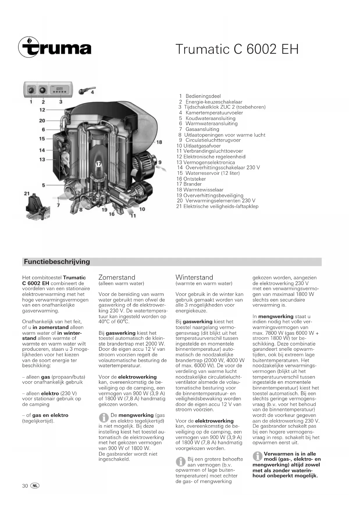 - Sgocciolamento d'acqua dalla valvola di sicurezza/di scarico elettrica. – Nessuna tensione di alimentazione. – Fusibile stufa o veicolo difettoso. – La temperatura impostata sul unità di comando è inferiore alla temperatura ambiente. – Finestra aperto sopra il camino (interruttore da finestra). – Tensione della batteria insufficiente < 10,5 V. – Bombola del gas o valvola di chiusura rapida nel tubo di ali- mentazione del gas chiusa. – Alimentazione dell'aria interrotta. – Uscite per l'aria calda bloccate. – Regolatore della pressione del gas congelato. – Percentuale di butano della bombola del gas troppo elevata. – Nessuna tensione di alimentazione. – Il fusibile dell’apparecchio è difettoso. – È scattato l’interruttore anti-surriscaldamento. – Temperatura esterna sotto i 4°C. – Manca l'alimentazione della corrente di 12 V sulla valvola di scarico. – Temperatura esterna sotto gli 8°C. – Manca l'alimentazione della corrente di 12 V sulla valvola di scarico. – Pressione dell'acqua troppo alta. – Controllare la tensione della batteria da 12 V. – Controllare tutti i collegamenti a spina elettrici. – Controllare il fusibile dell’apparecchio (ved. Manutenzione). – Controllare il fusibile del veicolo. – Impostare la temperatura ambiente sul unità di comando ad un valore superiore. – Chiudere la finestra. – Caricare la batteria. – Controllare l'alimentazione del gas. – Controllare il camino per verificare l'eventuale presenza di ostruzioni. – In caso d'uso su imbarcazioni, aprire il camino a tetto. – Controllo delle singole aperture di uscita. – Utilizzare il regolatore dell'impianto deghiacciante (EisEx). – Utilizzare propano (il butano non è adatto per il riscaldamento particolarmente con temperature inferiori ai 10°C). – Controllare la tensione di alimentazione da 230 V ed i fusibili. – Controllare il fusibile dell’apparecchio (ved. Manutenzione). – Ripristinare l’interruttore anti-surriscaldamento (ved. Manutenzione). – Accendere il riscaldamento (in caso di temperature intorno ai 4°C e inferiori, la valvola di scarico si apre automaticamente). – Controllare la tensione di alimentazione da 12 V ed i fusibili. – Accendere il riscaldamento (senza riscaldamento, la valvola di scarico può essere richiusa solo in caso di temperature superiori agli 8°C). – Controllare la tensione di alimentazione da 12 V ed i fusibili. – Controllare la pressione della pompa (max. 2,8 bar). In caso di collegamento ad un'alimentazione dell'acqua centrale (collegamento regionale o urbano) deve essere impiegato un riduttore di pressione che impedisca il raggiungimento di pressioni superiori a 2,8 bar nel boiler. Istruzioni di ricerca guasti Anomalia Causa Rimedio Qualora queste misure non consentissero di eliminare l'anomalia, si prega di rivolgersi essenzialmente al servizio di assistenza Truma.30 Trumatic C 6002 EH 1 Bedieningsdeel 2 Energie-keuzeschakelaar 3 Tijdschakelklok ZUC 2 (toebehoren) 4 Kamertemperatuurvoeler 5 Koudwateraansluiting 6 Warmwateraansluiting 7 Gasaansluiting 8 Uitlaatopeningen voor warme lucht 9 Circulatieluchtterugvoer 10 Uitlaatgasafvoer 11 Verbrandingsluchttoevoer 12 Elektronische regeleenheid 13 Vermogenselektronica 14 Oververhittingsschakelaar 230 V 15 Waterreservoir (12 liter) 16 Ontsteker 17 Brander 18 Warmtewisselaar 19 Oververhittingsbeveiliging 20 Verwarmingselementen 230 V 21 Elektrische veiligheids-/aftapklep Functiebeschrijving Het combitoestel Trumatic C 6002 EH combineert de voordelen van een stationaire elektroverwarming met het hoge verwarmingsvermogen van een onafhankelijke gasverwarming. Onafhankelijk van het feit, of u in zomerstand alleen warm water of in winter- stand alleen warmte of warmte en warm water wilt produceren, staan u 3 moge- lijkheden voor het kiezen van de soort energie ter beschikking: – alleen gas (propaan/buta) voor onafhankelijk gebruik – alleen elektro (230 V) voor stationair gebruik op de camping – of gas en elektro (tegelijkertijd). Zomerstand (alleen warm water) Voor de bereiding van warm water gebruikt men ofwel de gaswerking of de elektrower- king 230 V. De watertempera- tuur kan ingesteld worden op 40°C of 60°C. Bij gaswerking kiest het toestel automatisch de klein- ste brandertrap met 2000 W. Door de eigen accu 12 V van stroom voorzien regelt de volautomatische besturing de watertemperatuur. Voor de elektrowerking kan, overeenkomstig de be- veiliging op de camping, een vermogen van 900 W (3,9 A) of 1800 W (7,8 A) handmatig gekozen worden. De mengwerking (gas en elektro tegelijkertijd) is niet mogelijk. Bij deze instelling kiest het toestel au- tomatisch de elektrowerking met het gekozen vermogen van 900 W of 1800 W. De gasbrander wordt niet ingeschakeld. Winterstand (warmte en warm water) Voor gebruik in de winter kan gebruik gemaakt worden van alle 3 mogelijkheden voor energiekeuze. Bij gaswerking kiest het toestel naargelang vermo- gensvraag (dit blijkt uit het temperatuurverschil tussen ingestelde en momentele binnentemperatuur) auto- matisch de noodzakelijke brandertrap (2000 W, 4000 W of max. 6000 W). De voor de verdeling van warme lucht noodzakelijke circulatielucht- ventilator alsmede de volau- tomatische besturing voor de binnentemperatuur- en veiligheidsbewaking worden door de eigen accu 12 V van stroom voorzien. Voor de elektrowerking kan, overeenkomstig de be- veiliging op de camping, een vermogen van 900 W (3,9 A) of 1800 W (7,8 A) handmatig voorgekozen worden. Bij een grotere behoefte aan vermogen (b.v. opwarmen of lage buiten- temperaturen) moet echter de gas- of mengwerking gekozen worden, aangezien de elektrowerking 230 V met een verwarmingsvermo- gen van maximaal 1800 W slechts een secundaire verwarming is. In mengwerking staat u indien nodig het volle ver- warmingsvermogen van max. 7800 W (gas 6000 W + stroom 1800 W) ter be- schikking. Deze combinatie garandeert snelle opwarm- tijden, ook bij extreem lage buitentemperatur