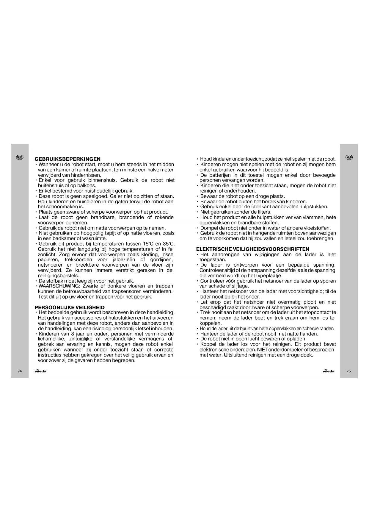 - Kinderen van 8 jaar en ouder, personen met verminderde lichamelijke, zintuiglijke of verstandelijke vermogens of gebrek aan ervaring en kennis, mogen deze robot enkel gebruiken wanneer zij onder toezicht staan of correcte instructies hebben gekregen over het veilig gebruik ervan en voor zover zij de gevaren hebben begrepen.