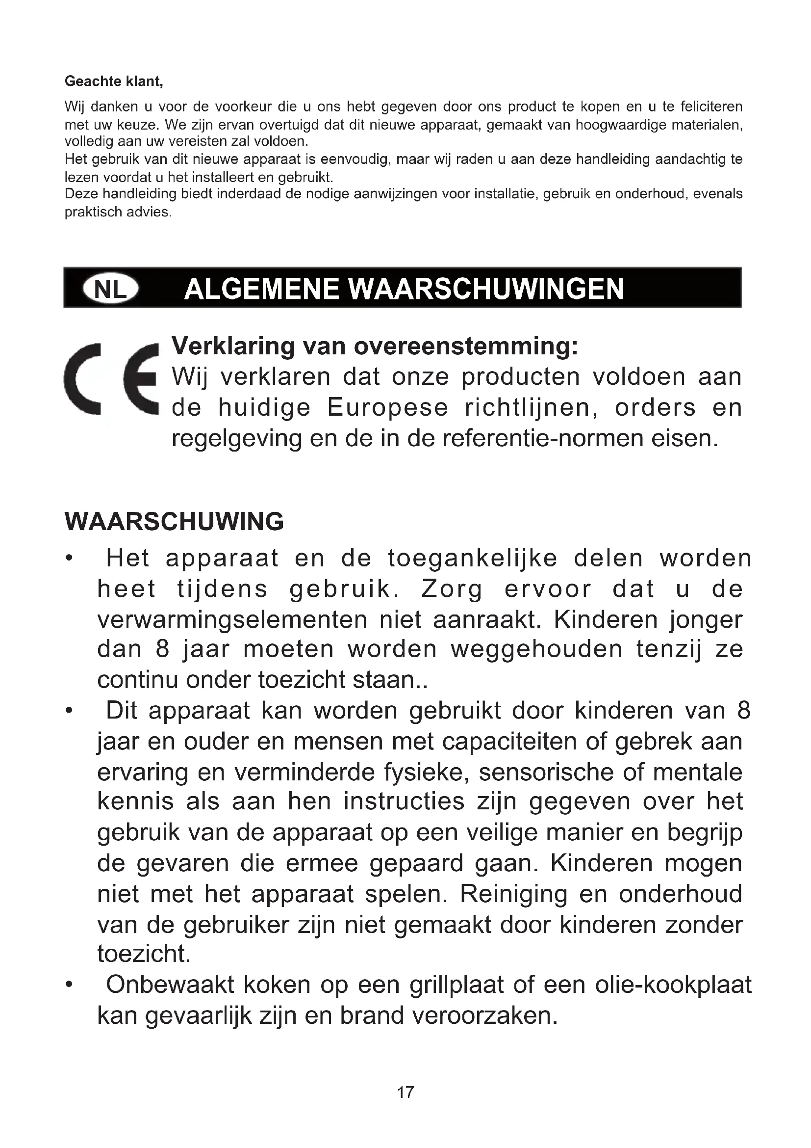 - Onbewaakt koken op een grillplaat of een olie-kookplaat kan gevaarlijk zijn en brand veroorzaken. Geachte klant, Wij danken u voor de voorkeur die u ons hebt gegeven door ons product te kopen en u te feliciteren met uw keuze. We zijn ervan overtuigd dat dit nieuwe apparaat, gemaakt van hoogwaardige materialen, volledig aan uw vereisten zal voldoen. Het gebruik van dit nieuwe apparaat is eenvoudig, maar wij raden u aan deze handleiding aandachtig te lezen voordat u het installeert en gebruikt. Deze handleiding biedt inderdaad de nodige aanwijzingen voor installatie, gebruik en onderhoud, evenals praktisch advies. DE FABRIKANT