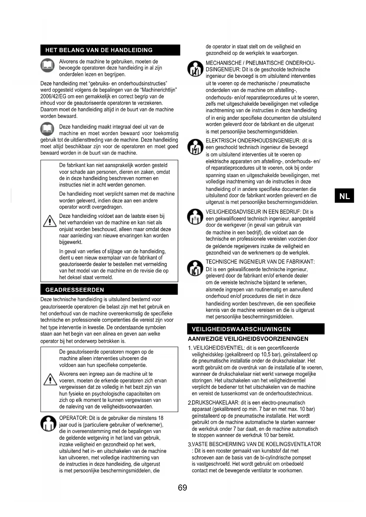 DSINGENIEUR: Dit is de geschoolde technische ingenieur die bevoegd is om uitsluitend interventies uit te voeren op de mechanische / pneumatische onderdelen van de machine om afstelling-, onderhouds- en/of reparatieprocedures uit te voeren, zelfs met uitgeschakelde beveiligingen met volledige inachtneming van de instructies in deze handleiding of in enig ander specieke documenten die uitsluitend worden geleverd door de fabrikant en die uitgerust is met persoonlijke beschermingsmiddelen. ELEKTRISCH ONDERHOUDSINGENIEUR: dit is een geschoold technisch ingenieur die bevoegd is om uitsluitend interventies uit te voeren op elektrische apparaten om afstelling-, onderhouds- en/ of reparatieprocedures uit te voeren, ook bij onder spanning staan en uitgeschakelde beveiligingen, met volledige inachtneming van de instructies in deze handleiding of in andere specieke documenten die uitsluitend door de fabrikant worden geleverd en die uitgerust is met persoonlijke beschermingsmiddelen. VEILIGHEIDSADVISEUR IN EEN BEDRIJF: Dit is een gekwaliceerd technisch ingenieur, aangesteld door de werkgever (in geval van gebruik van de machine in een bedrijf), die voldoet aan de technische en professionele vereisten voorzien door de geldende regelgevers inzake de veiligheid en gezondheid van de werknemers op de werkplek. TECHNISCHE INGENIEUR VAN DE FABRIKANT: Dit is een gekwaliceerde technische ingenieur, geleverd door de fabrikant en/of erkende dealer om de vereiste technische bijstand te verlenen, alsmede ingrepen van routinematig en aanvullend onderhoud en/of procedures die niet in deze handleiding worden beschreven, die een specieke kennis van de machine vereisen en die is uitgerust met persoonlijke beschermingsmiddelen. OPERATOR: Dit is de gebruiker die minstens 18 jaar oud is (particuliere gebruiker of werknemer), die in overeenstemming met de bepalingen van de geldende wetgeving in het land van gebruik, inzake veiligheid en gezondheid op het werk, uitsluitend het in- en uitschakelen van de machine kan uitvoeren, met volledige inachtneming van de instructies in deze handleiding, die uitgerust is met persoonlijke beschermingsmiddelen, die Deze technische handleiding is uitsluitend bestemd voor geautoriseerde operatoren die belast zijn met het gebruik en het onderhoud van de machine overeenkomstig de specieke technische en professionele competenties die vereist zijn voor het type interventie in kwestie. De onderstaande symbolen staan aan het begin van een alinea en geven aan welke operator bij het onderwerp betrokken is. Deze handleiding maakt integraal deel uit van de machine en moet worden bewaard voor toekomstig gebruik tot de uitdiensttreding van de machine. Deze handleiding moet altijd beschikbaar zijn voor de operatoren en moet goed bewaard worden in de buurt van de machine. Alvorens de machine te gebruiken, moeten de bevoegde operatoren deze handleiding in al zijn onderdelen lezen en begrijpen. Deze handleiding met “gebruiks- en onderhoudsinstructies” werd opgesteld volgens de bepalingen van de “Machinerichtlijn” 2006/42/EG om een gemakkelijk en correct begrip van de inhoud voor de geautoriseerde operatoren te verzekeren. Daarom moet de handleiding altijd in de buurt van de machine worden bewaard.