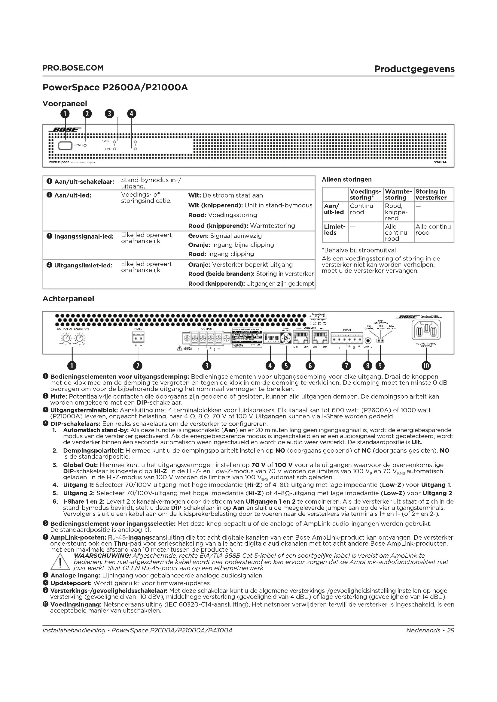 en 70 V RMS automatisch geladen. In de Hi-Z-modus van 100 V worden de limiters van 100 V RMS automatisch geladen. 4. Uitgang 1: Selecteer 70/100V-uitgang met hoge impedantie (Hi-Z) of 4–8Ω-uitgang met lage impedantie (Low-Z) voor Uitgang 1. 5. Uitgang 2: Selecteer 70/100V-uitgang met hoge impedantie (Hi-Z) of 4–8Ω-uitgang met lage impedantie (Low-Z) voor Uitgang 2. 6. I-Share 1 en 2: Levert 2 x kanaalvermogen door de stroom van Uitgangen 1 en 2 te combineren. Als de versterker uit staat of zich in de stand-bymodus bevindt, stelt u deze DIP-schakelaar in op Aan en sluit u de meegeleverde jumper aan op de vier uitgangsterminals. Vervolgens sluit u een kabel aan om de luidsprekerbelasting door te voeren naar de versterkers via terminals 1+ en 1- (of 2+ en 2-). t Bedieningselement voor ingangsselectie: Met deze knop bepaalt u of de analoge of AmpLink-audio-ingangen worden gebruikt. Destandaardpositie is analoog 1:1. y AmpLink-poorten: RJ-45-ingangsaansluiting die tot acht digitale kanalen van een Bose AmpLink-product kan ontvangen. Deversterker ondersteunt ook een Thru-pad voor serieschakeling van alle acht digitale audiokanalen met tot acht andere BoseAmpLink-producten, met een maximale afstand van 10 meter tussen de producten. WAARSCHUWING: Afgeschermde, rechte EIA/TIA 568B Cat 5-kabel of een soortgelijke kabel is vereist om AmpLink te bedienen. Een niet-afgeschermde kabel wordt niet ondersteund en kan ervoor zorgen dat de AmpLink-audiofunctionaliteit niet juist werkt. Sluit GEEN RJ-45-poort aan op een ethernetnetwerk. u Analoge ingang: Lijningang voor gebalanceerde analoge audiosignalen. i Updatepoort: Wordt gebruikt voor firmware-updates. o Versterkings-/gevoeligheidsschakelaar: Met deze schakelaar kunt u de algemene versterkings-/gevoeligheidsinstelling instellen op hoge versterking (gevoeligheid van -10 dBV), middelhoge versterking (gevoeligheid van 4 dBU) of lage versterking (gevoeligheid van 14 dBU). a Voedingsingang: Netsnoeraansluiting (IEC 60320-C14-aansluiting). Het netsnoer verwijderen terwijl de versterker is ingeschakeld, iseen acceptabele manier van uitschakelen. q w e r t y u i o a Alleen storingen Voedings- storing* Warmte- storing Storing in versterker Aan/ uit-led Continu rood Rood, knippe- rend