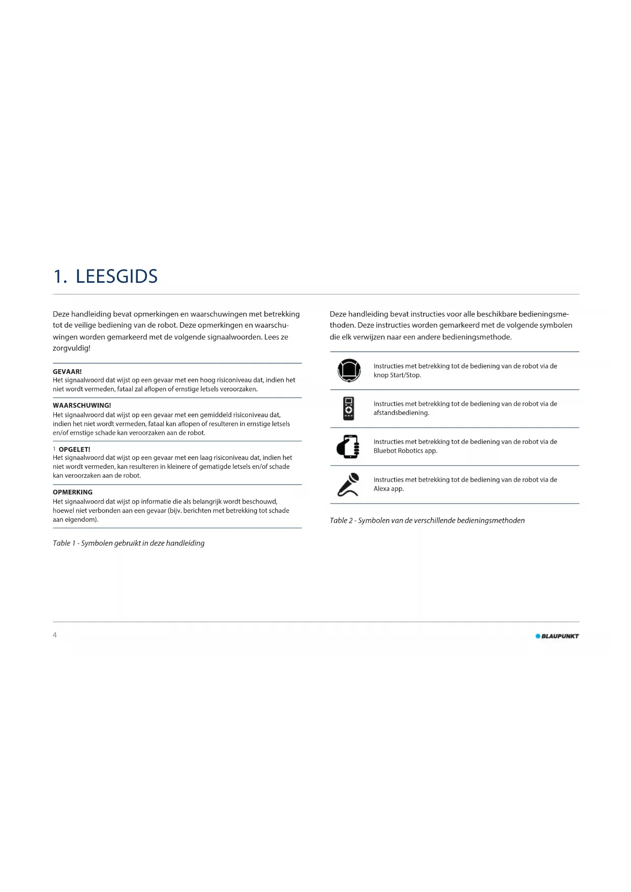 OPGELET! Het signaalwoord dat wijst op een gevaar met een laag risiconiveau dat, indien het niet wordt vermeden, kan resulteren in kleinere of gematigde letsels en/of schade kan veroorzaken aan de robot. OPMERKING Het signaalwoord dat wijst op informatie die als belangrijk wordt beschouwd, hoewel niet verbonden aan een gevaar (bijv. berichten met betrekking tot schade aan eigendom). Table 1 - Symbolen gebruikt in deze handleiding Deze handleiding bevat instructies voor alle beschikbare bedieningsme- thoden. Deze instructies worden gemarkeerd met de volgende symbolen die elk verwijzen naar een andere bedieningsmethode. Instructies met betrekking tot de bediening van de robot via de knop Start/Stop. Instructies met betrekking tot de bediening van de robot via de afstandsbediening. Instructies met betrekking tot de bediening van de robot via de Bluebot Robotics app. Instructies met betrekking tot de bediening van de robot via de Alexa app. Table 2 - Symbolen van de verschillende bedieningsmethoden5