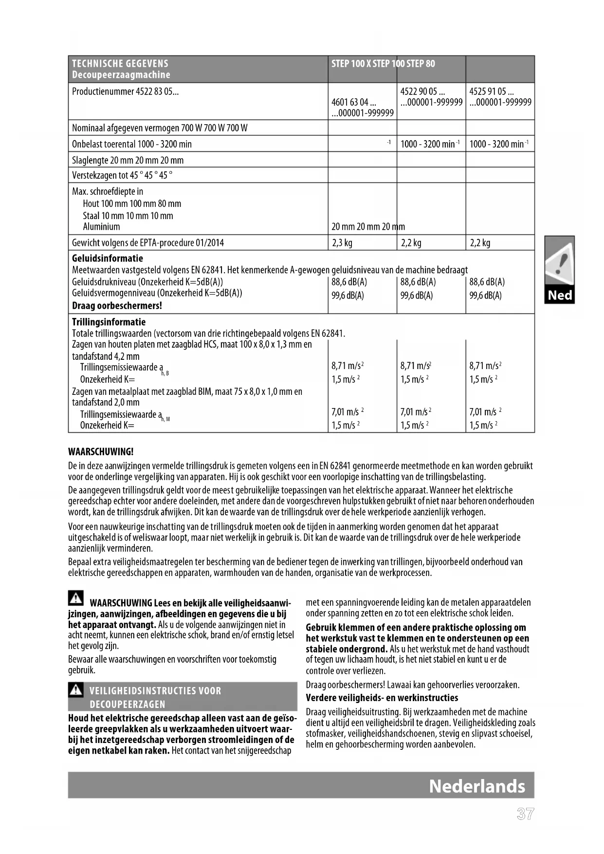 WAARSCHUWING! De in deze aanwijzingen vermelde trillingsdruk is gemeten volgens een in EN 62841 genormeerde meetmethode en kan worden gebruikt voor de onderlinge vergelijking van apparaten. Hij is ook geschikt voor een voorlopige inschatting van de trillingsbelasting. De aangegeven trillingsdruk geldt voor de meest gebruikelijke toepassingen van het elektrische apparaat. Wanneer het elektrische gereedschap echter voor andere doeleinden, met andere dan de voorgeschreven hulpstukken gebruikt of niet naar behoren onderhouden wordt, kan de trillingsdruk afwijken. Dit kan de waarde van de trillingsdruk over de hele werkperiode aanzienlijk verhogen. Voor een nauwkeurige inschatting van de trillingsdruk moeten ook de tijden in aanmerking worden genomen dat het apparaat uitgeschakeld is of weliswaar loopt, maar niet werkelijk in gebruik is. Dit kan de waarde van de trillingsdruk over de hele werkperiode aanzienlijk verminderen. Bepaal extra veiligheidsmaatregelen ter bescherming van de bediener tegen de inwerking van trillingen, bijvoorbeeld onderhoud van elektrische gereedschappen en apparaten, warmhouden van de handen, organisatie van de werkprocessen. WAARSCHUWING Lees en bekijk alle veiligheidsaanwi- jzingen, aanwijzingen, afbeeldingen en gegevens die u bij het apparaat ontvangt. Als u de volgende aanwijzingen niet in acht neemt, kunnen een elektrische schok, brand en/of ernstig letsel het gevolg zijn. Bewaar alle waarschuwingen en voorschriften voor toekomstig gebruik. VEILIGHEIDSINSTRUCTIES VOOR DECOUPEERZAGEN Houd het elektrische gereedschap alleen vast aan de geïso- leerde greepvlakken als u werkzaamheden uitvoert waar- bij het inzetgereedschap verborgen stroomleidingen of de eigen netkabel kan raken. Het contact van het snijgereedschap met een spanningvoerende leiding kan de metalen apparaatdelen onder spanning zetten en zo tot een elektrische schok leiden. Gebruik klemmen of een andere praktische oplossing om het werkstuk vast te klemmen en te ondersteunen op een stabiele ondergrond. Als u het werkstuk met de hand vasthoudt of tegen uw lichaam houdt, is het niet stabiel en kunt u er de controle over verliezen. Draag oorbeschermers! Lawaai kan gehoorverlies veroorzaken. Verdere veiligheids- en werkinstructies Draag veiligheidsuitrusting. Bij werkzaamheden met de machine dient u altijd een veiligheidsbril te dragen. Veiligheidskleding zoals stofmasker, veiligheidshandschoenen, stevig en slipvast schoeisel, helm en gehoorbescherming worden aanbevolen. Ned3838 Nederlands Stof die vrijkomt tijdens het werken vormt vaak een gevaar voor de gezondheid en mag niet met het lichaam in aanraking komen. Machines met stofafzuiging gebruiken en tevens geschikte stofmaskers dragen. Vrijgekomen stof grondig verwijderen resp. opzuigen. Het is niet toegestaan, materialen te bewerken waarvan een gezondheidsgevaar uitgaat (bijv. asbest). Schakel het apparaat onmiddellijk uit als het gereedschap blokkeert! Schakel het apparaat niet in zolang het gereedschap geblokkeerd is; dit zou een terugslag met een hoog reactiemo- ment kunnen veroorzaken.Achterhaal en verhelp de oorzaak voor de blokkering van het gereedschap met inachtneming van de veiligheidsinstructies. Mogelijke oorzaken zijn: