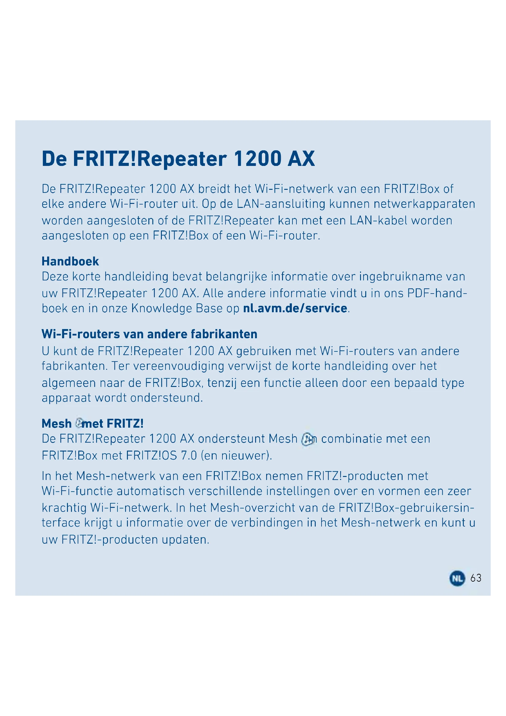 browser. Appare l’interfaccia utente del FRITZ!Repeater.62 Aspetti giuridici Dichiarazione di conformità CE AVM dichiara che il FRITZ!Repeater è conforme ai requisiti fondamentali e alle disposizioni inerenti delle direttive 2014/53/UE, 2009/125/CE e 2011/65/UE. Il testo integrale della dichiarazione di conformità CE è disponibile in lingua inglese all’indirizzo en.avm.de/ce. Dati diagnostici Per migliorare il vostro prodotto e per garantire un funzionamento sicuro, AVM usa rapporti di errore e, se necessario, dati diagnostici. È possibile modicare queste impostazioni cliccando sotto il menu su Indice e poi a fondo pagina su ServiziAVM. Smaltimento In conformità con le leggi europee, il FRITZ!Repeater e i cavi non vanno smaltiti con i riuti domestici, bensì consegnati, al termine del loro ciclo di vita, presso un centro di raccolta autorizzato. Note legali Le note legali e le condizioni di licenza si trovano nella guida dell’interfaccia utente.63 De FRITZ!Repeater 1200 AX De FRITZ!Repeater 1200 AX breidt het Wi-Fi-netwerk van een FRITZ!Box of elke andere Wi-Fi-router uit. Op de LAN-aansluiting kunnen netwerkapparaten worden aangesloten of de FRITZ!Repeater kan met een LAN-kabel worden aangesloten op een FRITZ!Box of een Wi-Fi-router. Handboek Deze korte handleiding bevat belangrijke informatie over ingebruikname van uw FRITZ!Repeater 1200 AX. Alle andere informatie vindt u in ons PDF-hand- boek en in onze Knowledge Base op nl.avm.de/service. Wi-Fi-routers van andere fabrikanten U kunt de FRITZ!Repeater 1200 AX gebruiken met Wi-Fi-routers van andere fabrikanten. Ter vereenvoudiging verwijst de korte handleiding over het algemeen naar de FRITZ!Box, tenzij een functie alleen door een bepaald type apparaat wordt ondersteund. Mesh met FRITZ! De FRITZ!Repeater 1200 AX ondersteunt Mesh in combinatie met een FRITZ!Box met FRITZ!OS 7.0 (en nieuwer). In het Mesh-netwerk van een FRITZ!Box nemen FRITZ!-producten met Wi-Fi-functie automatisch verschillende instellingen over en vormen een zeer krachtig Wi-Fi-netwerk. In het Mesh-overzicht van de FRITZ!Box-gebruikersin- terface krijgt u informatie over de verbindingen in het Mesh-netwerk en kunt u uw FRITZ!-producten updaten.64 Omvang van de levering Omschrijving Afbeelding 1 FRITZ!Repeater1200AX 1 LAN-kabel 1 korte handleiding geen afbeelding Veiligheid Veiligheidsaanwijzingen voor FRITZ!Repeater 1200 AX Handeling Ventilatieroosters niet afdekken Geen vloeistoen laten binnendringen Niet openen en niet ondeskundig repareren Vóór het reinigen van het stroom loskoppelen Alleen reinigen met een licht vochtig doekje Plaats van gebruik Alleen aansluiten op goed bereikbare stopcontacten Droge en stofvrije omgeving Niet buiten gebruiken65 Omvang van de levering Omschrijving Afbeelding 1 FRITZ!Repeater1200AX 1 LAN-kabel 1 korte handleiding geen afbeelding Veiligheid Veiligheidsaanwijzingen voor FRITZ!Repeater 1200 AX Handeling Ventilatieroosters niet afdekken Geen vloeistoen laten binnendringen Niet openen en niet ondeskundig repareren Vóór het reinigen van het stroom loskoppelen Alleen reinigen met een licht vochtig doekje Plaats van gebruik Alleen aansluiten op goed bereikbare stopcontacten Droge en stofvrije omgeving Niet buiten gebruiken66 Verbindingsmogelijkheden U kunt de FRITZ!Repeater 1200 AX via Wi-Fi of met een LAN-kabel met een FRITZ!Box verbinden. Wi-Fi-verbinding met de FRITZ!Box wanneer LAN-verbinding met de FRITZ!Box wanneer de FRITZ! Repeater binnen het Wi-Fi-bereik van de FRITZ!Box moet worden gebruikt de FRITZ!Repeater buiten het Wi-Fi-be- reik van de FRITZ!Box of een andere repeater in het thuisnetwerk moet worden gebruikt een netwerkapparaat zonder Wi-Fi via de LAN-aansluiting van de repeater moet wor- den opgenomen in het thuisnetwerk. een LAN-verbinding kan worden gemaakt (bijvoorbeeld netwerkbekabe- ling in huis) Info Connect/WPS Fon/DECT WLAN Power/DSL Wi-Fi LAN Info Connect/WPS Fon/DECT WLAN Power/DSL Wi-Fi LAN Lees verder bij ‘Wi-Fi-verbinding instellen’ op pagina68. Lees verder bij ‘LAN-verbinding instellen’ op pagina69. Eigenschappen van het apparaat Omschrijving Afbeelding Functie Handeling/betekenis Toets Connect verbinding tot stand brengen gedurende 1 seconde ingedrukt houden met andere basis verbinden gedurende 6 seconden ingedrukt houden fabrieksinstellingen laden gedurende 15 seconden ingedrukt houden Led brandt verbinding tot stand gebracht; goede verbinding knippert langzaam (om de 2 seconden): niet met FRITZ!Box verbonden, geen Wi-Fi-verbinding ingesteld snel (2 keer per seconde): bezig met een proces zoals WPS, opnieuw opstarten of updaten brandt zwakke verbinding knippert verbinding onderbroken uit Wi-Fi niet actief; mogelijk is er een tijdschakeling ingesteld Bus LAN Netwerkapparatuur per kabel verbinden67 Verbindingsmogelijkheden U kunt de FRITZ!Repeater 1200 AX via Wi-Fi of met een LAN-kabel met een FRITZ!Box verbinden. Wi-Fi-verbinding met de FRITZ!Box wanneer LAN-verbinding met de FRITZ!Box wanneer de FRITZ! Repeater binnen het Wi-Fi-bereik van de FRITZ!Box moet worden gebruikt de FRITZ!Repeater buiten het Wi-Fi-be- reik van de FRITZ!Box of een andere repeater in het thuisnetwerk moet worden gebruikt een netwerkapparaat zonder Wi-Fi via de LAN-aansluiting van de repeater moet wor- den opgenomen in het thuisnetwerk. een LAN-verbinding kan worden gemaakt (bijvoorbeeld netwerkbekabe- ling in huis) Info Connect/WPSFon/DECT WLAN Power/DSL Wi-Fi LAN Info Connect/WPSFon/DECT WLAN Power/DSL Wi-Fi LAN Lees verder bij ‘Wi-Fi-verbinding instellen’ op pagina68. Lees verder bij ‘LAN-verbinding instellen’ op pagina69. Wi-Fi68 Wi-Fi-verbinding instellen Handeling Afbeelding
