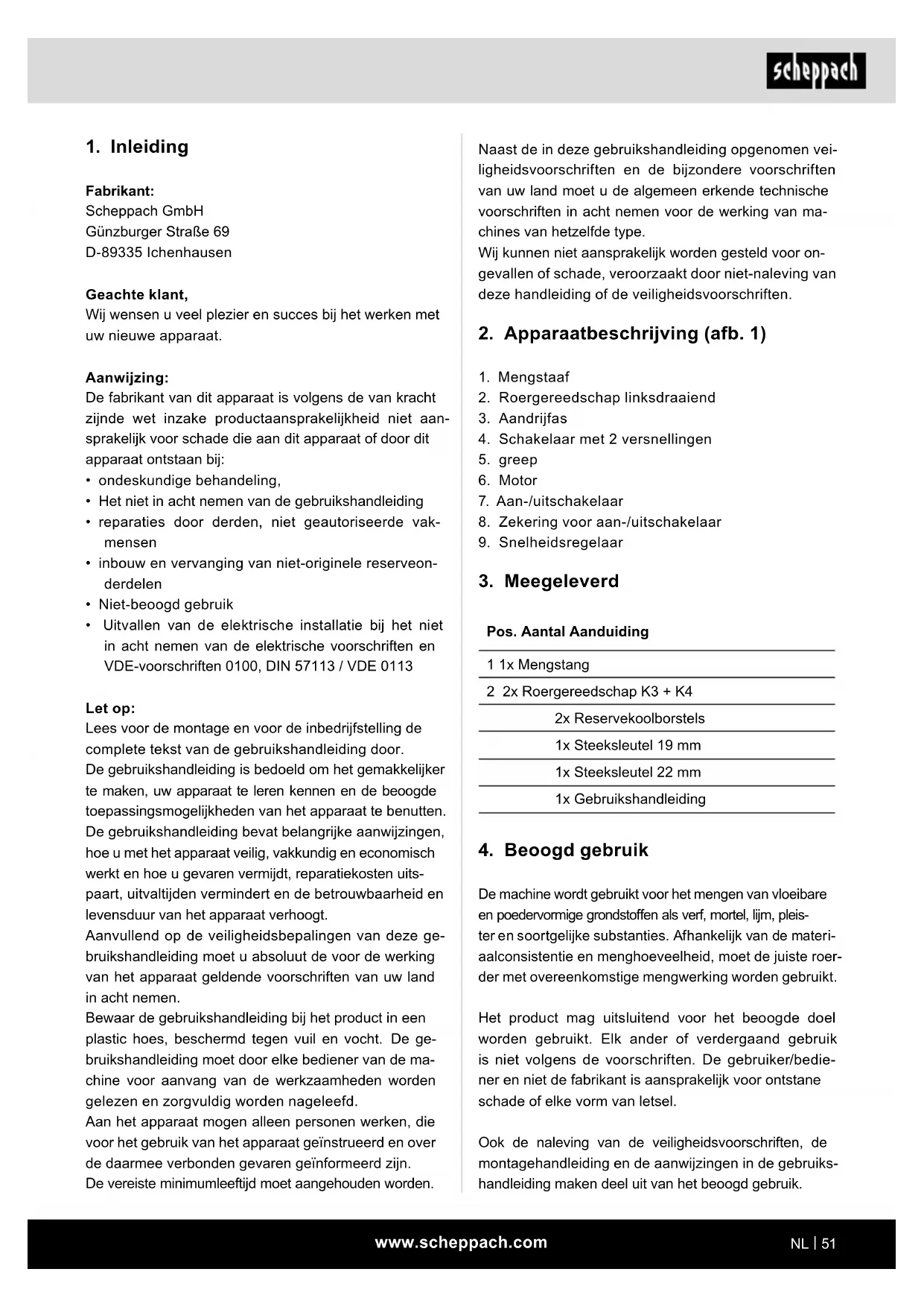 a) Laat uw elektrisch gereedschap uitsluitend door gekwaliceerd deskundig personeel repareren met uitsluitend originele reserve- onderdelen. Hiermee blijft veilig gebruik van het elektrisch gereedschap gewaarborgd. m LET OP! Dit elektrisch apparaat genereert een elektromagne- tisch veld als het is ingeschakeld. Dit veld kan onder bepaalde omstandigheden interfereren met actieve of passieve medische implantaten. Om het risico op ernstig of dodelijk letsel te beperken, raden we perso- nen met medische implantaten aan om hun arts en de fabrikant van het medische implantaat te raadplegen voordat de machine wordt gebruikt. Veiligheidsvoorschriften voor roerapparaat a) Houd het elektrisch apparaat met de beide handen vast bij de hiervoor bestemde hand- grepen. Het verlies van controle kan tot letsel leiden. b) Zorg voor voldoende ventilatie bij het roeren van brandbare materialen om een gevaarlij- ke atmosfeer te vermijden. Dampen die zich vormen, kunnen worden ingeademd of ontstoken door de vonken die door het elektrisch apparaat worden geproduceerd. c) Roer geen voedsel. Elektrisch gereedschap en hun gereedschap is niet ontworpen om voedsel te verwerken. d) Houd de netsnoer buiten het gebied waar ge- werkt wordt. De netsnoer kan vast komen te zit- ten op de mengstaaf. e) Zorg ervoor dat de mengkom stabiel en stevig staat. Een niet goed beveiligde mengkom kan on- verwacht bewegen. f) Zorg ervoor dat er geen vloeistof tegen de be- huizing van het elektrische gereedschap spat. Vloeistof die in het elektrische gereedschap is gekomen, kan tot beschadigingen en elektrische schokken leiden. g) Volg de instructies en veiligheidsinstructies voor het te mengen materiaal. Het te mengen materiaal kan schadelijk voor de gezondheid zijn.www.scheppach.com