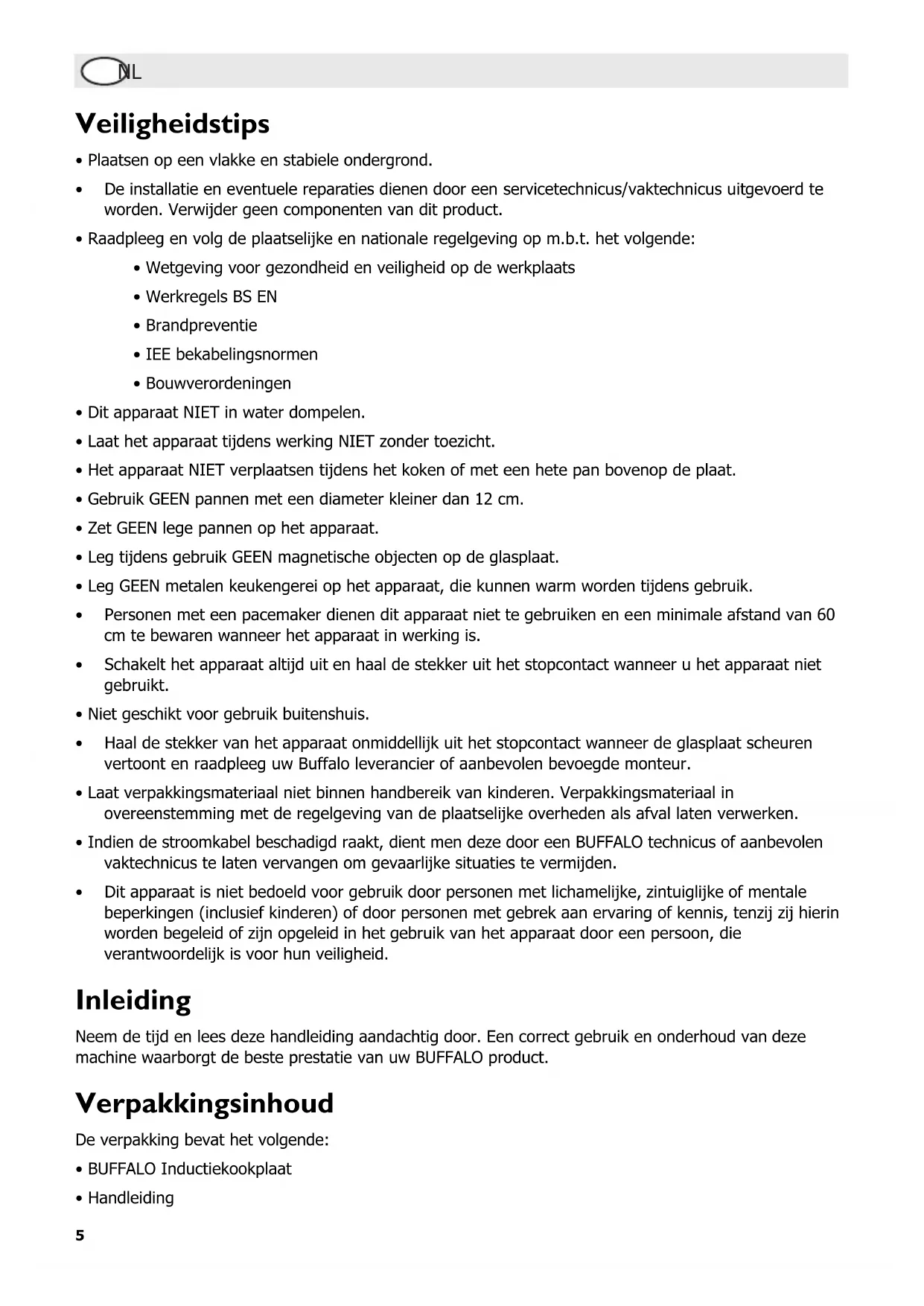 - Handleiding6 UKNL Klantenservice hulplijn: 0845 146 2887 (Verenigd Koninkrijk) BUFFALO is trots op de kwaliteit van haar producten en dienstverlening, en controleert de inhoud van de verpakkingen, tijdens de verpakkingsfase, op functionaliteit en schade. Mocht uw product door transport zijn beschadigd, neem dan onmiddellijk contact op met uw BUFFALO dealer. Installatie Voor een adequate ventilatie dient men een afstand van 15cm (6 inches) tussen het apparaat en de muren of andere objecten aan te houden. Werking Pannen Geschikte pannen zijn: