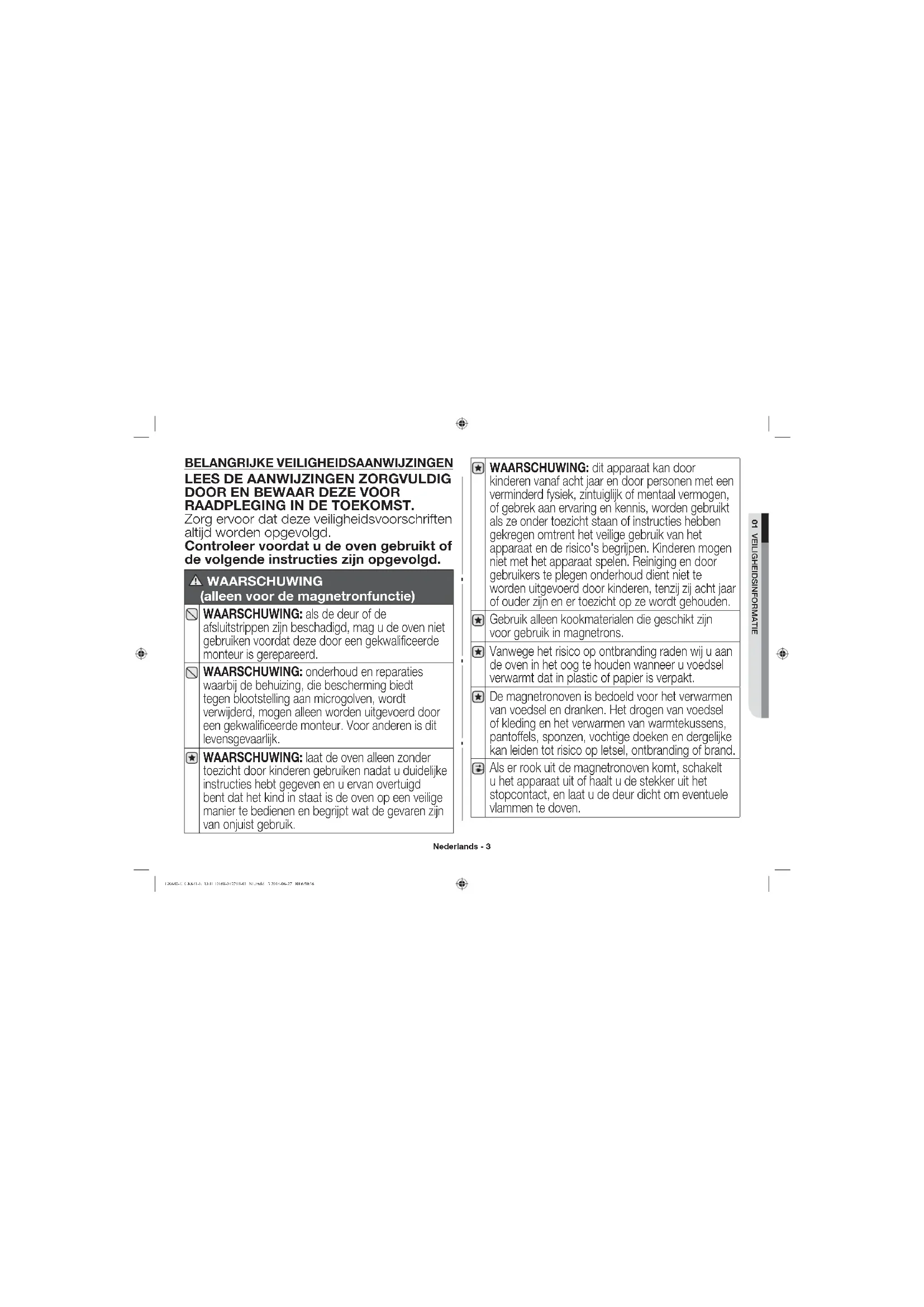 Controleer of het draaiplateau vrij kan ronddraaien. (Alleen type model met draaiplateau) dit apparaat kan door kinderen vanaf acht jaar en door personen met een verminderd fysiek, zintuiglijk of mentaal vermogen, of gebrek aan ervaring en kennis, worden gebruikt als ze onder toezicht staan of instructies hebben gekregen omtrent het veilige gebruik van het apparaat en de risico's begrijpen. Kinderen mogen niet met het apparaat spelen. Reiniging en onderhoud mogen niet zonder supervisie door kinderen worden uitgevoerd. Gebruik geen ruwe schuurmiddelen of metalen schrapers voor het reinigen van de glazen ovendeur. Het oppervlak raakt hierdoor bekrast, waardoor het glas kan barsten. Dit apparaat is niet bedoeld voor bediening met een externe timer of een apart systeem voor bediening op afstand. Dit product is Groep 2 Klasse A ISM-apparatuur. In Groep 2 is alle ISM-apparatuur ondergebracht waarmee opzettelijk radiofrequente energie wordt gegenereerd en/of gebruikt in de vorm van elektromagnetische straling voor de behandeling van materiaal, alsmede EDM- en booglasapparatuur. Klasse A-apparatuur is apparatuur die geschikt is voor gebruik in alle omgevingen anders dan woonomgevingen en in 10 cm achter 20 cm boven 10 cm ernaast 85 cm van de vloer GK640-E_GK641-E_XEU_DE68-04279B-01_NL.indd 6 2014-06-27 6:50:37Nederlands - 7 01 VEILIGHEIDSINFORMATIE