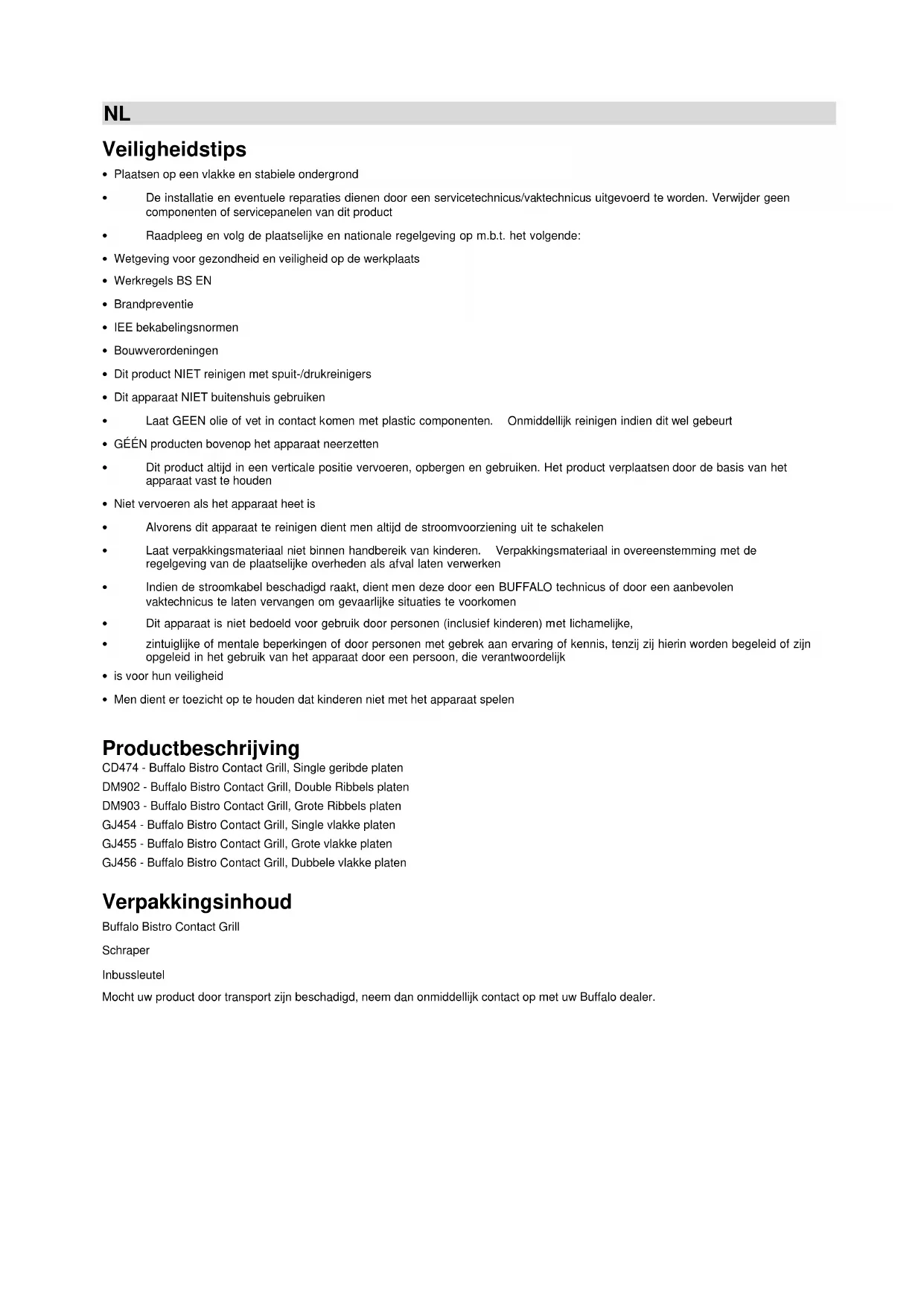 - Men dient er toezicht op te houden dat kinderen niet met het apparaat spelen Productbeschrijving CD474 - Buffalo Bistro Contact Grill, Single geribde platen DM902 - Buffalo Bistro Contact Grill, Double Ribbels platen DM903 - Buffalo Bistro Contact Grill, Grote Ribbels platen GJ454 - Buffalo Bistro Contact Grill, Single vlakke platen GJ455 - Buffalo Bistro Contact Grill, Grote vlakke platen GJ456 - Buffalo Bistro Contact Grill, Dubbele vlakke platen Verpakkingsinhoud Buffalo Bistro Contact Grill Schraper Inbussleutel Mocht uw product door transport zijn beschadigd, neem dan onmiddellijk contact op met uw Buffalo dealer.Klantenservice hulplijn: 040 2628080 NL Installatie Haal uw Buffalo Bistro Contact Grill uit de verpakking en vergewis u ervan dat er geen beschermingsfolie of resten ervan achtergebleven zijn op het apparaat. Plaats de grill op een vaste genivelleerde ondergrond. Buffalo raadt aan om een minimale ventilatieruimte van 100 mm rond het apparaat aan te houden. Zorg dat de RVS opvangbak correct is geplaatst. Steek de stekker in het stopcontact, u kunt de grill nu aanzetten en gebruiken. Het grilloppervlak voorbereiden – zorg dat het grilloppervlak schoon is, schakel het apparaat in en smeer de grillplaten in met een rijkelijke hoeveelheid olie. Met behulp van de thermostaatregelaar zet u de grill op 110˚C. Wanneer de grill op temperatuur is, schakelt u de grill uit en verwijdert u voorzichtig de overtollige olie van de platen. Werking Men dient de Contact Grill minimaal 5 minuten vóór gebruik in te schakelen Om de efficiënte werking bij onregelmatig gebruik te garanderen, raden wij u aan om de grillplaten dicht te houden en de thermostaatregelaar omlaag te draaien wanneer u de grill niet gebruikt. Dit zorgt voor een verlaging van het stroomverbruik en een snellere warmterespons wanneer het nodig is. Buffalo raadt aan om voor elk gebruik het grilloppervlak licht met olie in te smeren. Een temperatuurinstelling van 200°C tot 220°C is voldoende voor algemeen kookgebruik. Dit kan naar bepaalde soorten voedsel, individuele behoeften of ervaring variëren. Plaats het voedsel op het onderste grilloppervlak en breng de bovenste grillplaat omlaag. Vervolgens laten grillen naar wens.