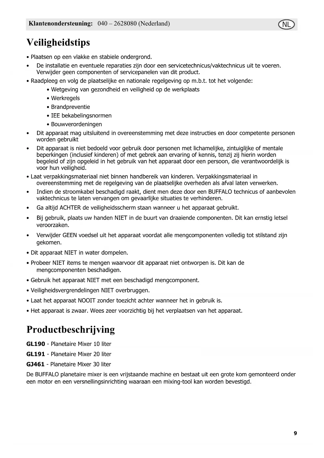 Klantenondersteuning: 040 – 2628080 (Nederland) Oplossen van problemen Indien er een storing van uw BUFFALO product optreedt, dient u de onderstaande tabel te raadplegen alvorens contact op te nemen met uw BUFFALO dealer of de Hulplijn te bellen. Technische specificaties Opmerking: controleer of de STOP-knop in de ontgrendelde positie staat wanneer u de mixer start. Draai de knop naar rechts om deze te ontgrendelen. Probleem Mogelijke oorzaak Handeling Het apparaat werkt niet Het apparaat staat uit Controleer of de stroomkabel van het apparaat is aangesloten en of het apparaat is ingeschakeldDe stopknop niet ontgrendeld (GJ461) Draai de knop naar rechts om deze te ontgrendelenSteker en kabel zijn beschadigd Laat een BUFFALO technicus of een vaktechnicus komenDe zekering in de steker is gesprongen Vervang de zekering in de stekerStroomvoorziening Controleer de stroomvoorzieningStoring interne bedrading Laat een BUFFALO technicus of een vaktechnicus komenDe overbelastingschakelaar is geactiveerd Raadpleeg de informatie over de overbelastingschakelaar in het hoofdstuk Werking in deze handleiding. Veiligheidskap is niet gesloten Sluit de veiligheidskap volledigGeen snelheid geselecteerd Selecteer een mixsnelheidMengkom niet in de hoogste stand Controleer of de mengkomhendel volledig naar achteren staatDe mengkom kan niet worden geplaatstDe mengkompinnen of bevestigingsdelen zijn vuil Reinig het apparaat Het apparaat raakt oververhit De mengkom is te vol Zet het apparaat uit en verwijder een deel van de inhoudHet apparaat is te lang achter elkaar gebruikt Zet het apparaat uit en laat deze gedurende 30 minuten afkoelenDe klopper draait niet op de juiste wijzeDe ketting zit los Laat een BUFFALO technicus of een vaktechnicus komen Kan geen snelheid selecteren Wieltanden niet uitgelijnd Zet het apparaat uit en draai voorzichtig de garde met de hand.Kies opnieuw een mixsnelheid Model Voltage Vermogen Stroom Komgrootte Afmetingen h x b x d mm Gewicht GL190 230V 50Hz 550W 1.8A 10 liters 610 x 395 x 395 38kg GL191 230V 50Hz 1100W 4,7A 20 liters 794 x 555 x 558 112kg GJ461 230V 50Hz 1500W 6,5 A 30 liters 1142 × 579 × 611 170kg16