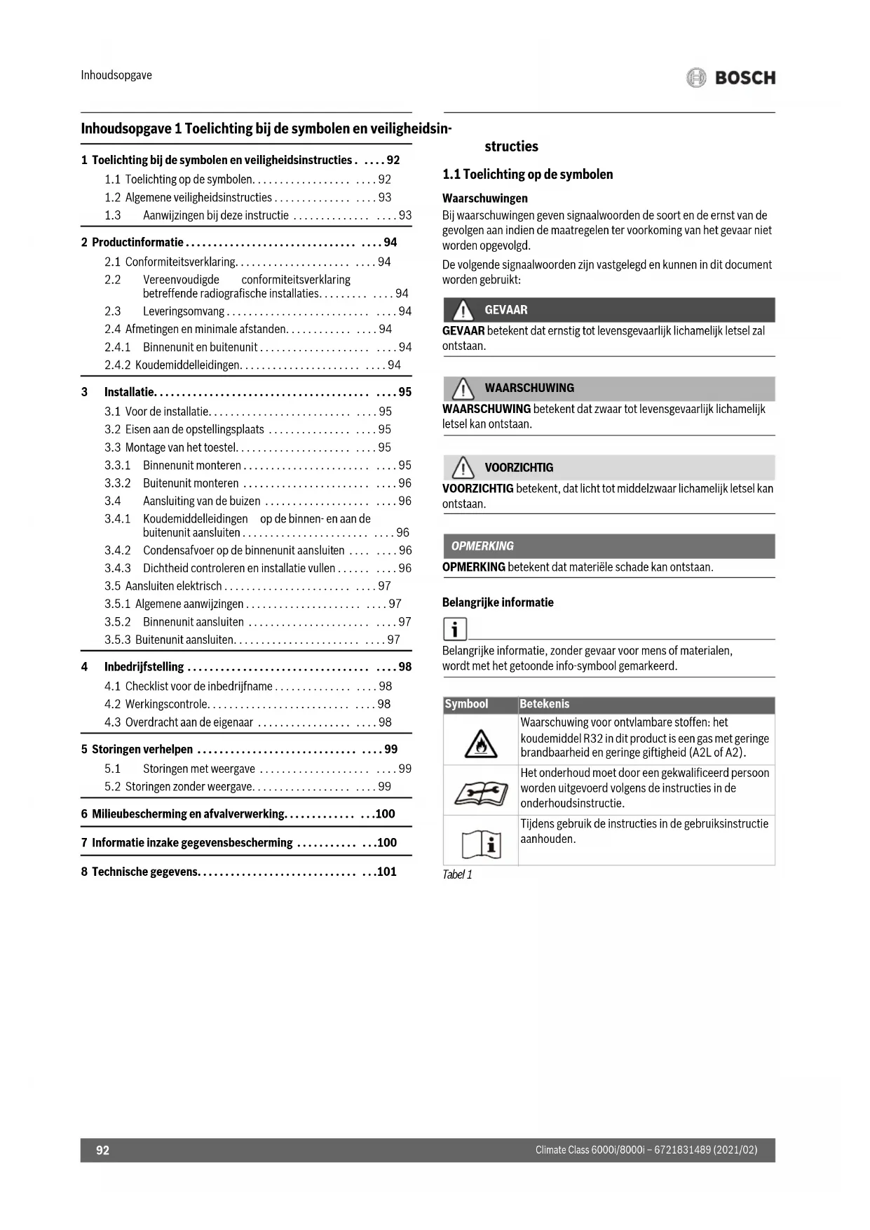 6 Milieubescherming en afvalverwerking. . . . . . . . . . . . . . . .100 7 Informatie inzake gegevensbescherming . . . . . . . . . . . . . .100 8 Technische gegevens. . . . . . . . . . . . . . . . . . . . . . . . . . . . . . . .101 Symbool Betekenis Waarschuwing voor ontvlambare stoffen: het koudemiddel R32 in dit product is een gas met geringe brandbaarheid en geringe giftigheid (A2L of A2). Het onderhoud moet door een gekwalificeerd persoon worden uitgevoerd volgens de instructies in de onderhoudsinstructie. Tijdens gebruik de instructies in de gebruiksinstructie aanhouden. OBJ_DCL-6721831489-001.fm Page 92 Wednesday, April 21, 2021 2:52 PMToelichting bij de symbolen en veiligheidsinstructies
