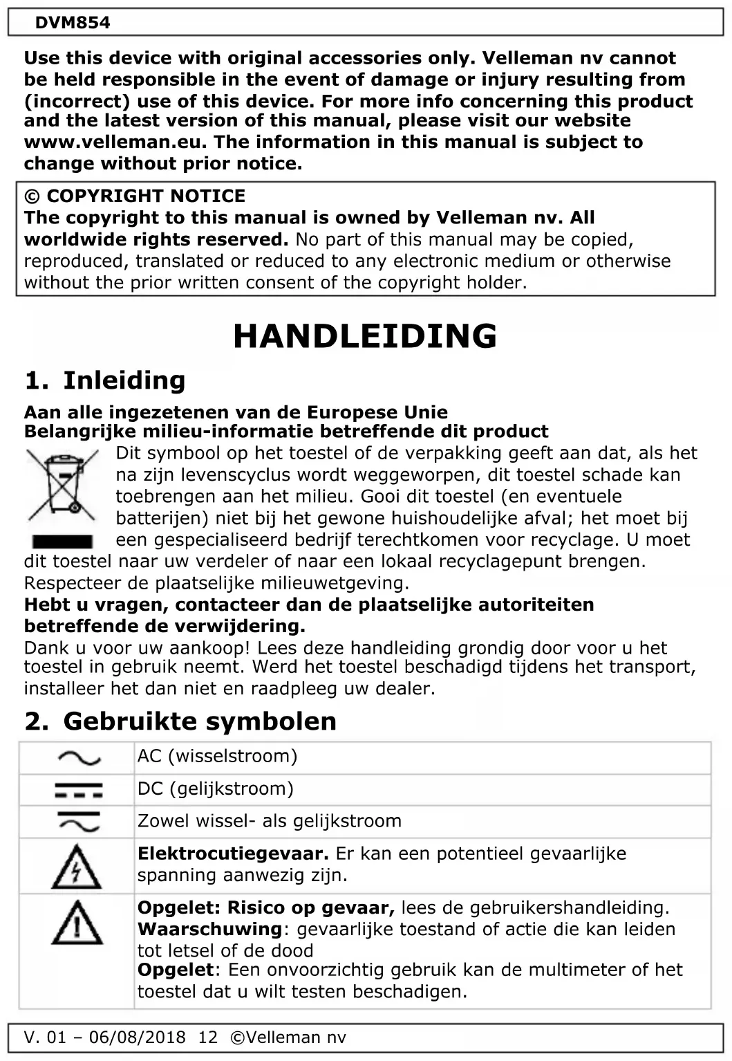 Opgelet: Risico op gevaar, lees de gebruikershandleiding. Waarschuwing: gevaarlijke toestand of actie die kan leiden tot letsel of de dood Opgelet: Een onvoorzichtig gebruik kan de multimeter of het toestel dat u wilt testen beschadigen.DVM854