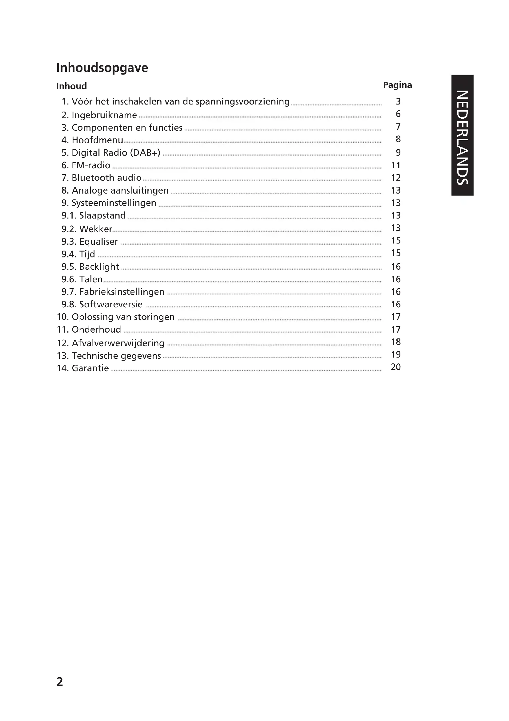 – Het apparaat is niet voorzien voor het luisteren met hoofdtelefoons. Om mogelijke gehoorschade te voorkomen, luistert u niet gedurende langere perioden met een hoog volume.5