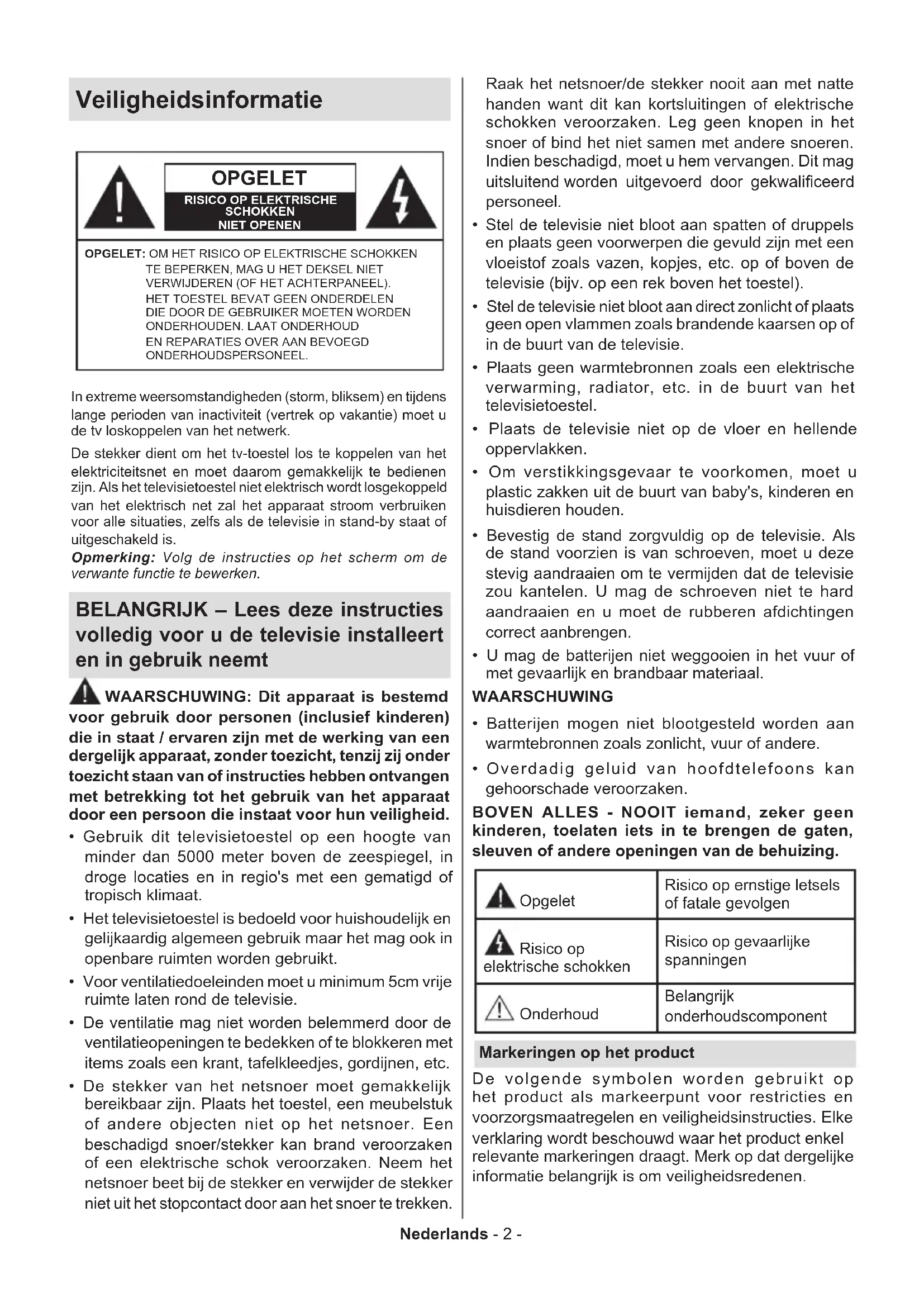 BELANGRIJK - Lees deze instructies volledig voor u de televisione installeert en in gebruik neemt