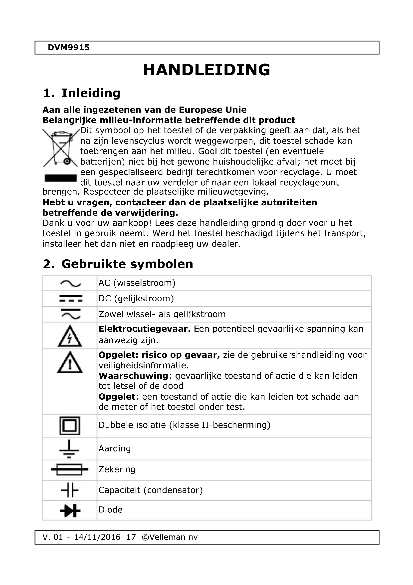 Wanneer het toestel voortdurend piept bij het uitvoeren van een continuïteitsmeting, betekent dit dat de interne zekering van F0.5 A/600 V defect is. Houd er rekening mee dat een lage batterijspanning kan leiden tot incorrecte metingen. Vervang de batterij regelmatig. (tip: U kunt dit ook zien aan de verminderde lichtsterkte van de achtergrondverlichting/lcd-display) Gebruik dit toestel enkel met originele accessoires. Velleman nv is niet aansprakelijk voor schade of kwetsuren bij (verkeerd) gebruik van dit toestel. Voor meer informatie over dit product en de laatste versie van deze handleiding, zie www.velleman.eu. De informatie in deze handleiding kan te allen tijde worden gewijzigd zonder voorafgaande kennisgeving. © AUTEURSRECHT Velleman nv heeft het auteursrecht voor deze handleiding. Alle wereldwijde rechten voorbehouden. Het is niet toegestaan om deze handleiding of gedeelten ervan over te nemen, te kopiëren, te vertalen, te bewerken en op te slaan op een elektronisch medium zonder voorafgaande schriftelijke toestemming van de rechthebbende.DVM9915