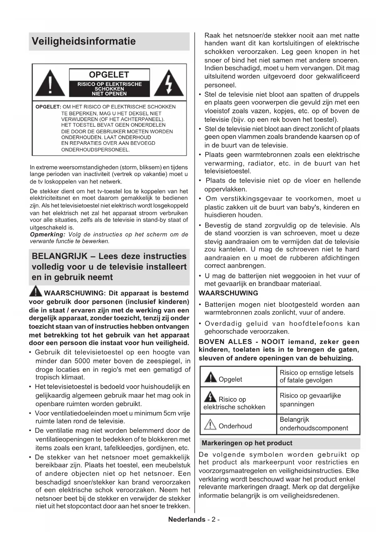 personeel. Stel de televisie niet bloot aan spatten of druppels en plaats geen voorwerpen die gevuld zijn met een vloeistof zoals vazen, kopjes, etc. op of boven de televisie (bijv. op een rek boven het toestel). Stel de televisie niet bloot aan direct zonlicht of plaats geen open vlammen zoals brandende kaarsen op of in de buurt van de televisie. Plaats geen warmtebronnen zoals een elektrische verwarming, radiator, etc. in de buurt van het televisietoestel. Plaats de televisie niet op de vloer en hellende oppervlakken. Om verstikkingsgevaar te voorkomen, moet u plastic zakken uit de buurt van baby's, kinderen en huisdieren houden. Bevestig de stand zorgvuldig op de televisie. Als de stand voorzien is van schroeven, moet u deze stevig aandraaien om te vermijden dat de televisie zou kantelen. U mag de schroeven niet te hard aandraaien en u moet de rubberen afdichtingen correct aanbrengen. U mag de batterijen niet weggooien in het vuur of met gevaarlijk en brandbaar materiaal. WAARSCHUWING Batterijen mogen niet blootgesteld worden aan warmtebronnen zoals zonlicht, vuur of andere. Overdadig geluid van hoofdtelefoons kan gehoorschade veroorzaken. BOVEN ALLES - NOOIT iemand, zeker geen kinderen, toelaten iets in te brengen de gaten, sleuven of andere openingen van de behuizing. Opgelet Risico op ernstige letsels of fatale gevolgen Risico op elektrische schokken Risico op gevaarlijke spanningen Onderhoud Belangrijk onderhoudscomponent Markeringen op het product De volgende symbolen worden gebruikt op het product als markeerpunt voor restricties en voorzorgsmaatregelen en veiligheidsinstructies. Elke