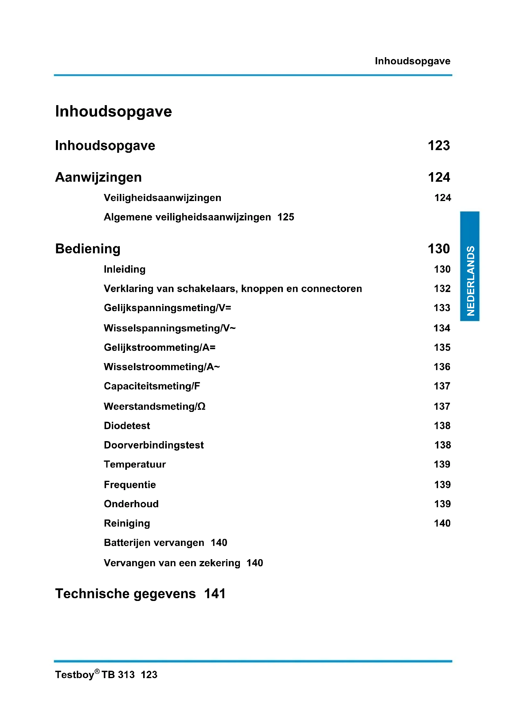 TB 313 123 NEDERLANDS Inhoudsopgave Inhoudsopgave 123 Aanwijzingen 124 Veiligheidsaanwijzingen 124 Algemene veiligheidsaanwijzingen 125 Bediening 130 Inleiding 130 Verklaring van schakelaars, knoppen en connectoren 132 Gelijkspanningsmeting/V= 133 Wisselspanningsmeting/V~ 134 Gelijkstroommeting/A= 135 Wisselstroommeting/A~ 136 Capaciteitsmeting/F 137 Weerstandsmeting/Ω 137 Diodetest 138 Doorverbindingstest 138 Temperatuur 139 Frequentie 139 Onderhoud 139 Reiniging 140 Batterijen vervangen 140 Vervangen van een zekering 140 Technische gegevens 141Aanwijzingen 124 Testboy