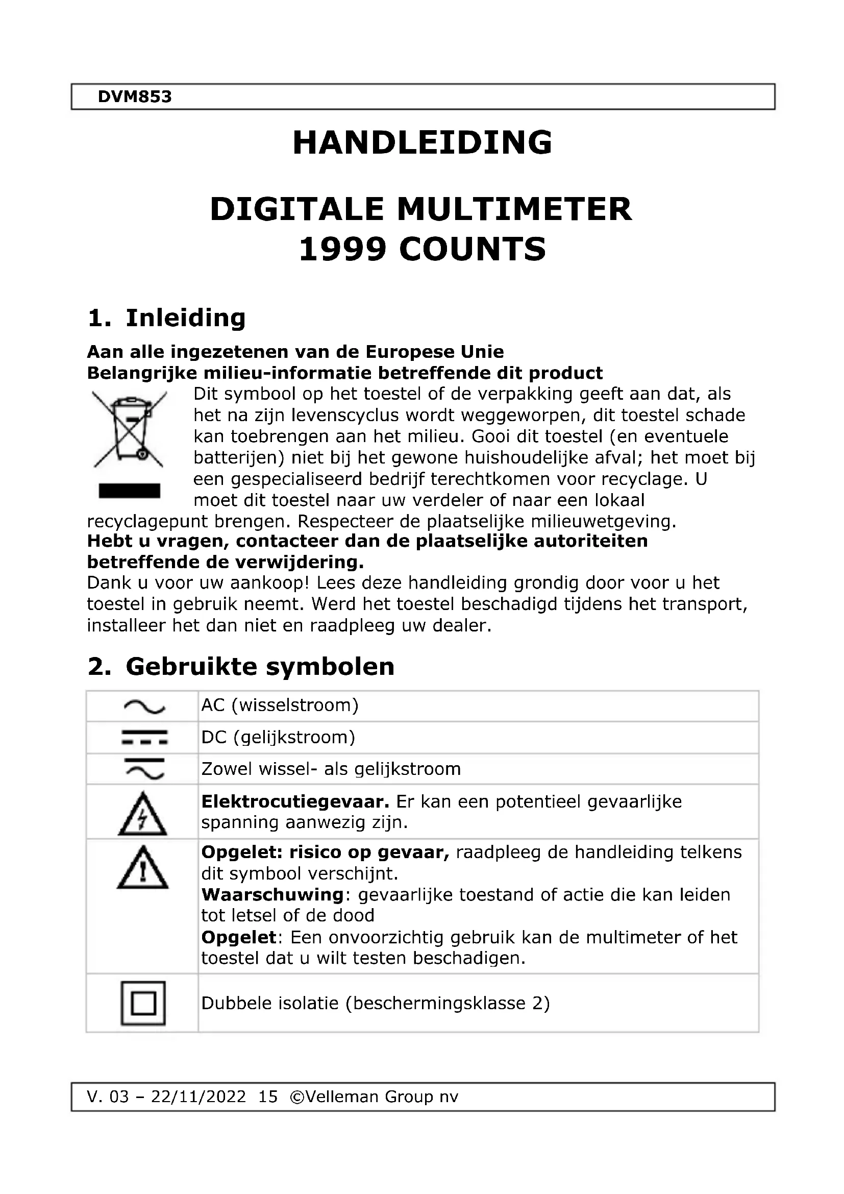 Functioneert het toestel niet meer correct tijdens het meten, dan is de interne zekering defect. Een lage batterijspanning kan leiden tot onnauwkeurige metingen. Vervang de batterij regelmatig. (tip: Vermindert de lichtsterkte van de achtergrondverlichting/LCD-display, dan is de batterij bijna leeg). Gebruik dit toestel enkel met originele accessoires. Velleman Group nv is niet aansprakelijk voor schade of kwetsuren bij (verkeerd) gebruik van dit toestel. Voor meer informatie over dit product en de laatste versie van deze handleiding, zie www.velleman.eu. De informatie in deze handleiding kan te allen tijde worden gewijzigd zonder voorafgaande kennisgeving.DVM853