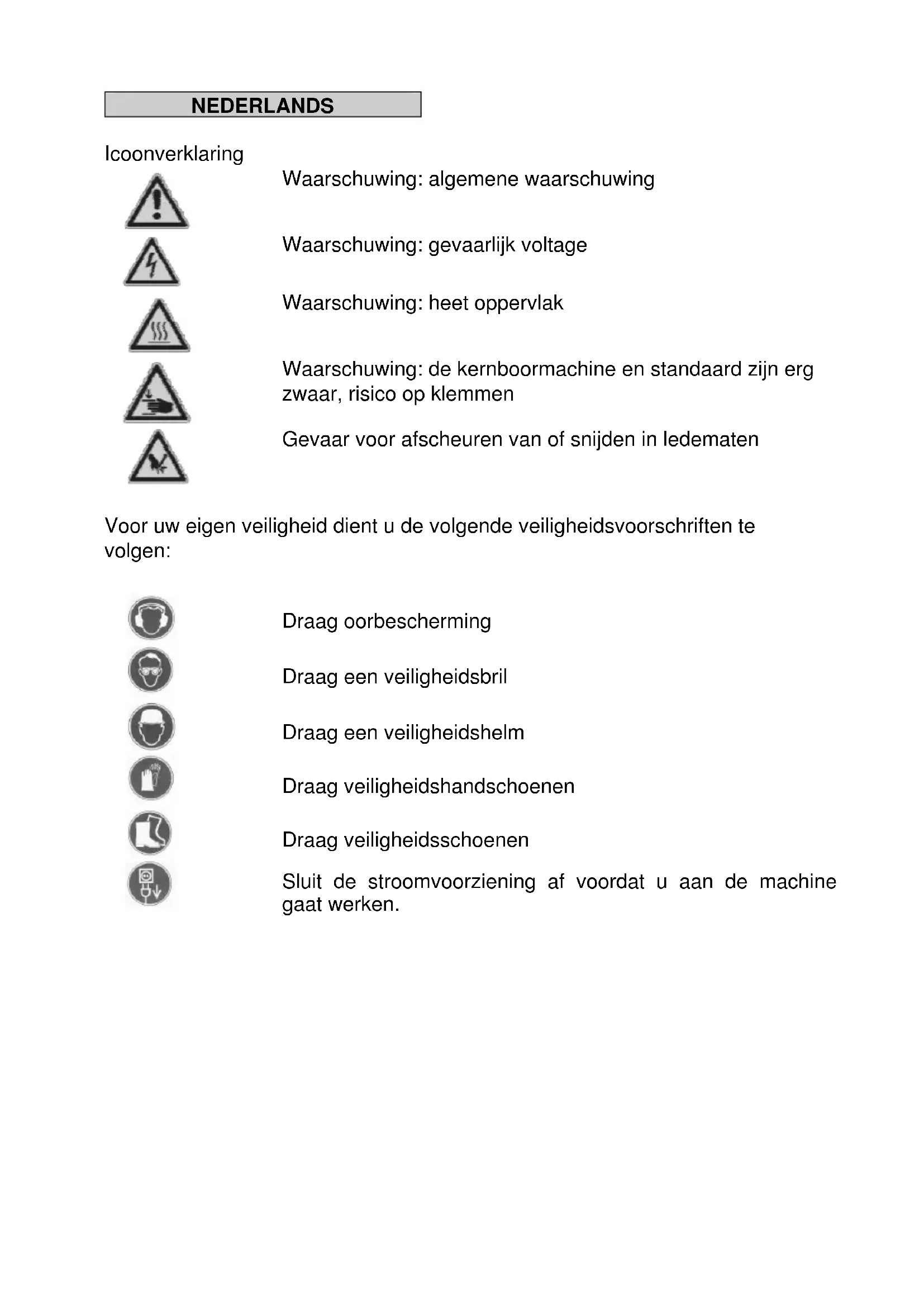 Zorg dat de machine niet aan direct regenwater blootgesteld wordt. Gebruik de machine niet in een omgeving met explosie gevaar. Gebruik de machine niet op een ladder. Boor niet in materiaal dat asbest bevat. Draag de machine nooit aan de kabel. Controleer altijd voor gebruik de machine, kabel en stekker. Reparaties dienen verricht te worden door een geautoriseerde specialist. Zorg dat de machine uit staat als de stroomvoorziening aangesloten wordt. Manipulatie van de machine leidt tot verbeuring van de garantie. Tijdens gebruik moet de machine constant onder toezicht zijn. De machine dient uit te staan en afgesloten van de stroomvoorziening indien: er geen toezicht is, bij plaatsen of verwijderen van de boor, bij stroomstoring en bij plaatsen of verwijderen van accessoires. Zet direct de machine uit indien de motor stopt tijdens gebruik. Zo voorkomt u een ongewenste plotselinge herstart van de motor. Niet gebruiken indien delen van de behuizing, de knoppen, de kabel of de stekker beschadigd zijn. Elektrisch gereedschap moet regelmatig visueel geïnspecteerd worden door een specialist. Tijdens gebruik van de boor mag nooit koelwater in de motor komen of in elektrische onderdelen. Boren boven het hoofd mag alleen uitgevoerd worden indien gepaste veiligheidsmaatregelen zijn genomen (water opvang). Stop het gebruik van de machine indien water uit de overloop kraan sijpelt bij de aansluiting kernboor. Breng de machine direct naar een geautoriseerde service dealer. Na een onderbreking van de werkzaamheden dient u de machine slechts dan aan te zetten als de kernboor vrij gedraaid kan worden. Draag altijd gehoorbescherming tijdens het gebruik van de machine. Raak de draaiende onderdelen niet aan. Personen onder de 16 jaar mogen deze machine niet bedienen.