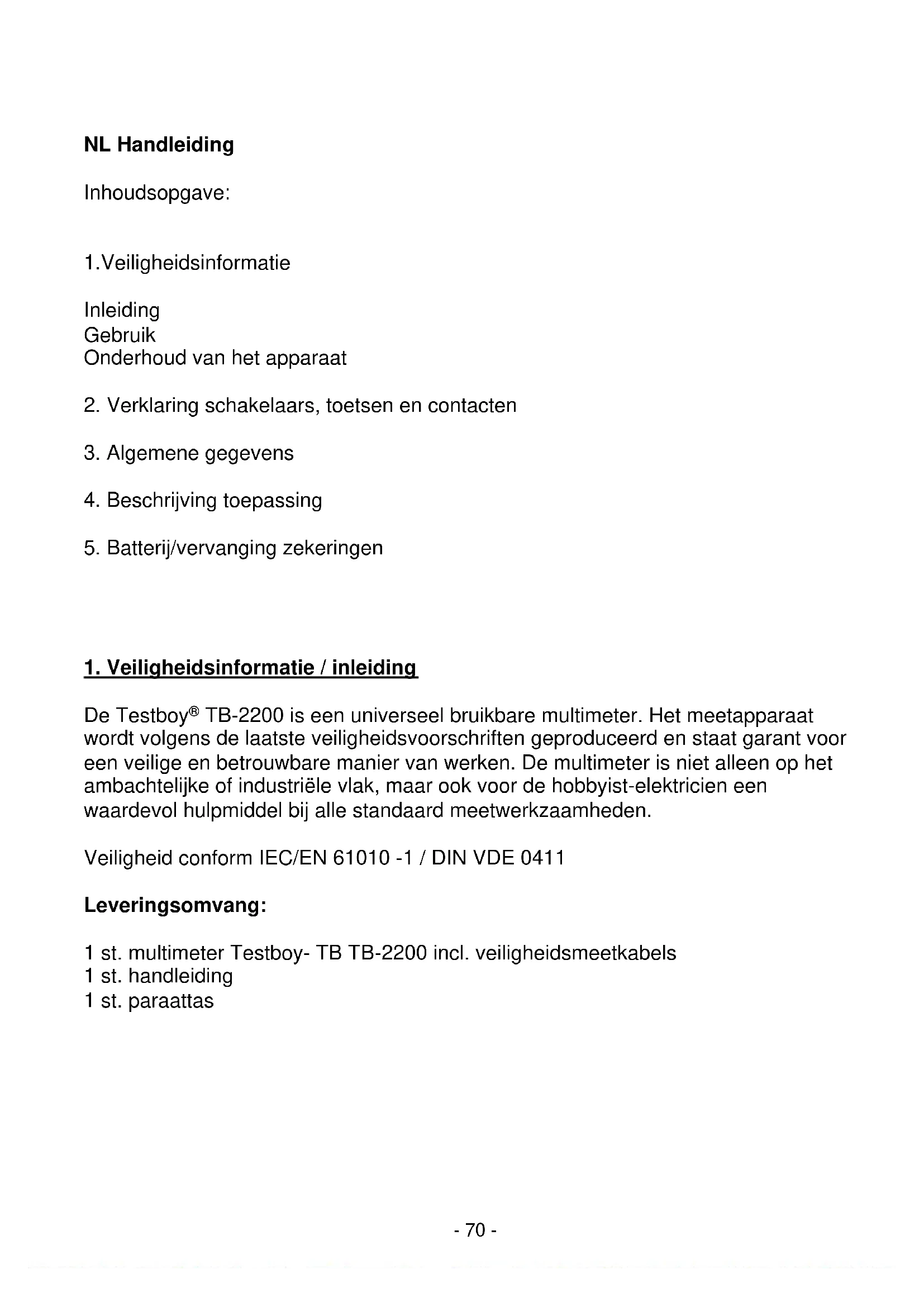 De Testboy TB-2200 verlaat de fabriek in een veiligheidstechnisch correcte staat. Om deze staat te behouden,要去 de gebruiker de veiligheidsvoorschriften in deze handleiding in acht nemen.