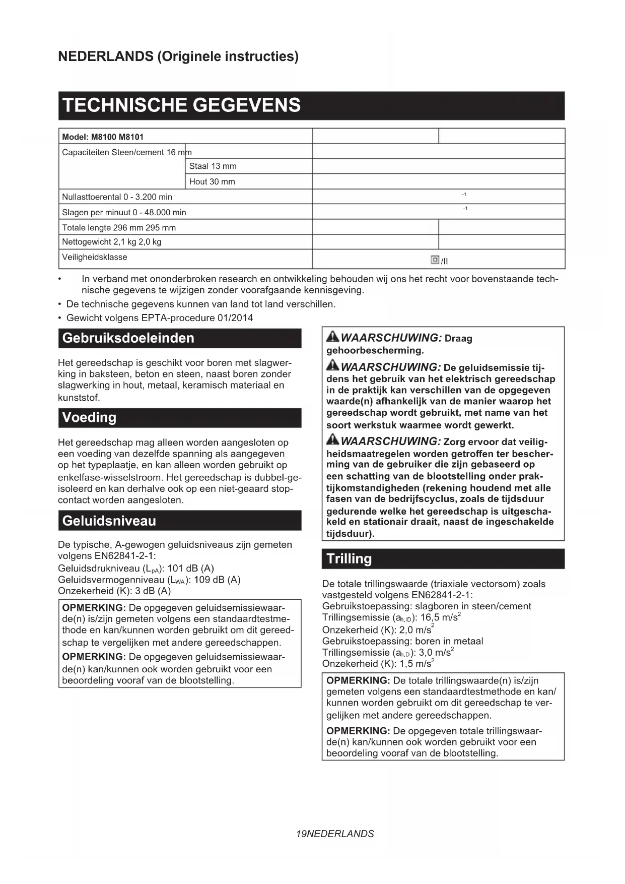 - Gewicht volgens EPTA-procedure 01/2014 Gebruiksdoeleinden Het gereedschap is geschikt voor boren met slagwer- king in baksteen, beton en steen, naast boren zonder slagwerking in hout, metaal, keramisch materiaal en kunststof. Voeding Het gereedschap mag alleen worden aangesloten op een voeding van dezelfde spanning als aangegeven op het typeplaatje, en kan alleen worden gebruikt op enkelfase-wisselstroom. Het gereedschap is dubbel-ge- isoleerd en kan derhalve ook op een niet-geaard stop- contact worden aangesloten. Geluidsniveau De typische, A-gewogen geluidsniveaus zijn gemeten volgens EN62841-2-1: Geluidsdrukniveau (L
