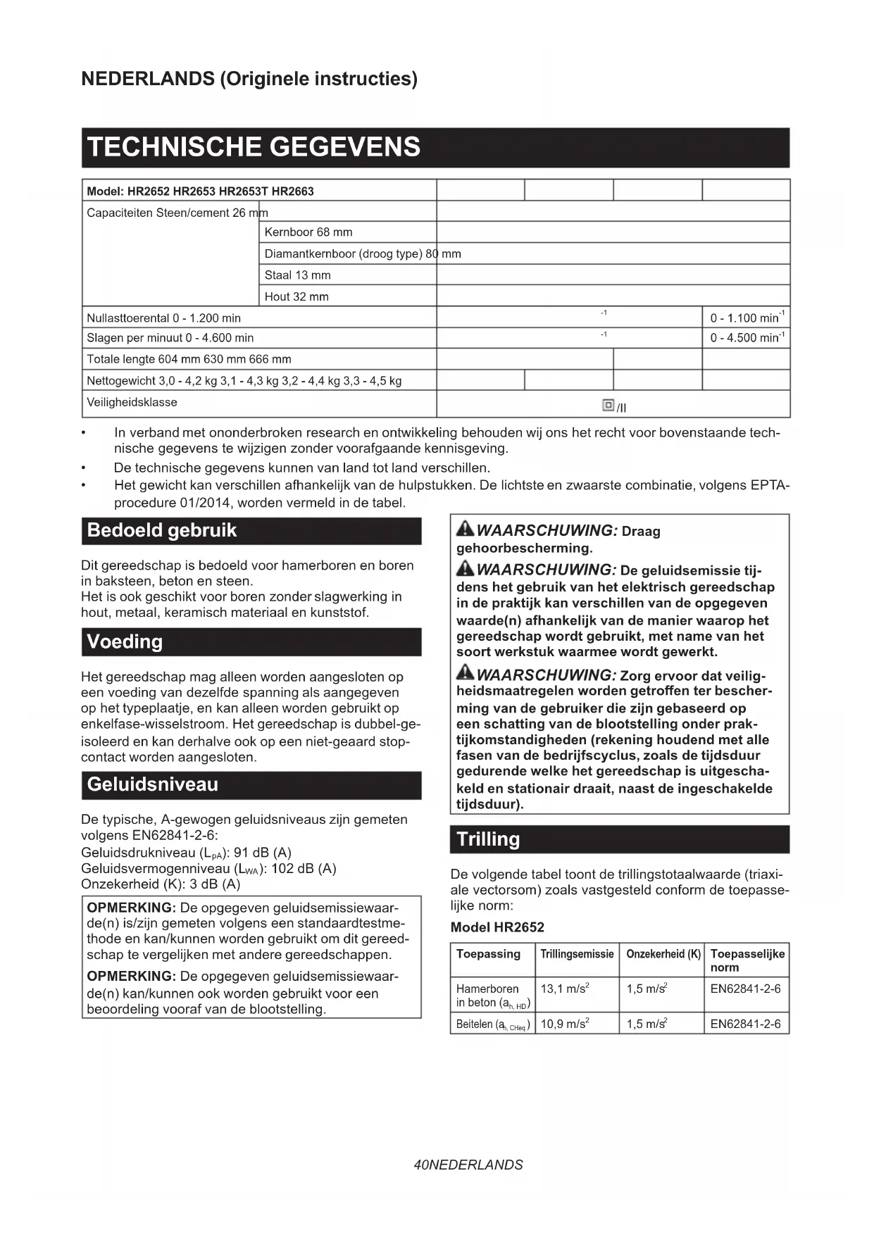 Model HR2653 ToepassingTrillingsemissieOnzekerheid (K)Toepasselijke norm Hamerboren in beton (ah, HD 11,2 m/s 1,5 m/s EN62841-2-6Beitelen (ah, CHeq 9,3 m/s 1,5 m/s EN62841-2-6 Model HR2653T ToepassingTrillingsemissieOnzekerheid (K)Toepasselijke norm Hamerboren in beton (ah, HD 10,9 m/s 1,5 m/s EN62841-2-6Beitelen (ah, CHeq 9,6 m/s 1,5 m/s EN62841-2-6 Model HR2663 ToepassingTrillingsemissieOnzekerheid (K)Toepasselijke norm Hamerboren in beton (ah, HD 9,3 m/s 1,5 m/s EN62841-2-6Beitelen (ah, CHeq 7,0 m/s 1,5 m/s EN62841-2-6 OPMERKING:Detotaletrillingswaarde(n)is/zijn gemeten volgens een standaardtestmethode en kan/ kunnen worden gebruikt om dit gereedschap te ver- gelijkenmetanderegereedschappen. OPMERKING: De opgegeven totale trillingswaar- de(n) kan/kunnen ook worden gebruikt voor een beoordeling vooraf van de blootstelling. WAARSCHUWING: De trillingsemissie tij- dens het gebruik van het elektrisch gereedschap in de praktijk kan verschillen van de opgegeven waarde(n) afhankelijk van de manier waarop het gereedschap wordt gebruikt, met name van het soort werkstuk waarmee wordt gewerkt. WAARSCHUWING: Zorg ervoor dat veilig- heidsmaatregelen worden getroen ter bescher- ming van de gebruiker die zijn gebaseerd op een schatting van de blootstelling onder prak- tijkomstandigheden (rekening houdend met alle fasen van de bedrijfscyclus, zoals de tijdsduur gedurende welke het gereedschap is uitgescha- keld en stationair draait, naast de ingeschakelde tijdsduur). EG-verklaring van conformiteit Alleen voor Europese landen DeEG-verklaringvanconformiteitisbijgevoegdals BijlageAbijdezegebruiksaanwijzing. VEILIGHEIDSWAAR- SCHUWINGEN Algemene veiligheidswaarschuwingen voor elektrisch gereedschap WAARSCHUWING: Lees alle veiligheids- waarschuwingen, aanwijzingen, afbeeldingen en technische gegevens behorend bij dit elektrische gereedschap aandachtig door. Als u niet alle onder- staandeaanwijzingennaleeft,kandatresulterenin brand, elektrische schokken en/of ernstig letsel. Bewaar alle waarschuwingen en instructies om in de toekomst te kunnen raadplegen. De term "elektrisch gereedschap" in de veiligheidsvoor- schriften duidt op gereedschappen die op stroom van het lichtnet werken (met snoer) of gereedschappen met een accu (snoerloos). VEILIGHEIDSWAARSCHUWINGEN