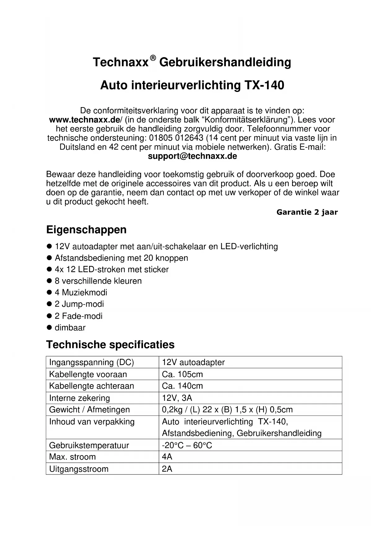 Gebruikershandleiding Auto interieurverlichting TX-140 De conformiteitsverklaring voor dit apparaat is te vinden op: www.technaxx.de/ (in de onderste balk “Konformitätserklärung”). Lees voor het eerste gebruik de handleiding zorgvuldig door. Telefoonnummer voor technische ondersteuning: 01805 012643 (14 cent per minuut via vaste lijn in Duitsland en 42 cent per minuut via mobiele netwerken). Gratis E-mail: support@technaxx.de Bewaar deze handleiding voor toekomstig gebruik of doorverkoop goed. Doe hetzelfde met de originele accessoires van dit product. Als u een beroep wilt doen op de garantie, neem dan contact op met uw verkoper of de winkel waar u dit product gekocht heeft. Garantie 2 jaar Eigenschappen 12V autoadapter met aan/uit-schakelaar en LED-verlichting Afstandsbediening met 20 knoppen 4x 12 LED-stroken met sticker 8 verschillende kleuren 4 Muziekmodi 2 Jump-modi 2 Fade-modi dimbaar Technische specificaties Ingangsspanning (DC) 12V autoadapter Kabellengte vooraan Ca. 105cm Kabellengte achteraan Ca. 140cm Interne zekering 12V, 3A Gewicht / Afmetingen 0,2kg / (L) 22 x (B) 1,5 x (H) 0,5cm Inhoud van verpakking Auto interieurverlichting TX-140, Afstandsbediening, Gebruikershandleiding Gebruikstemperatuur -20°C – 60°C Max. stroom