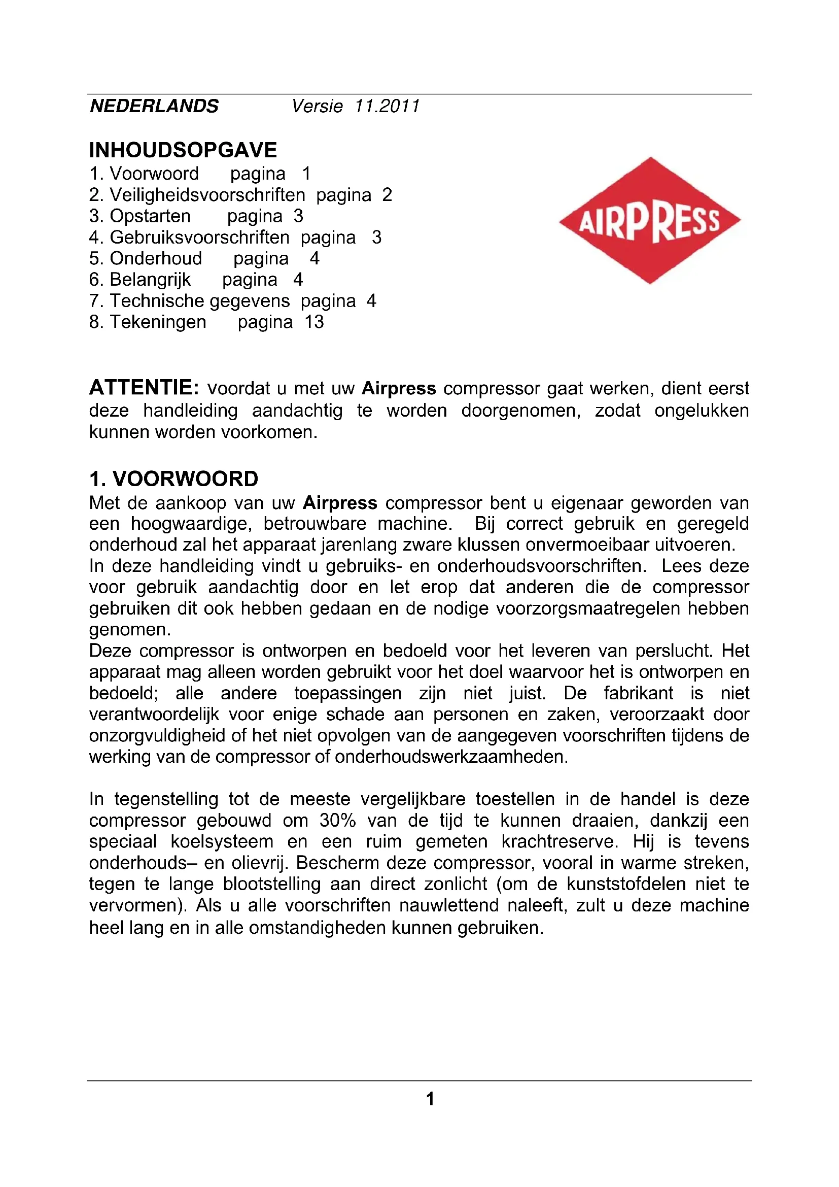 Met de aankoop van uw Airpress compressor bent u eigenaar geworden van een hoogwaardige, betrouwbare machine. Bij correct gebruik en geregeld onderhoud zal het apparaat jarenlang zware klussen onvermoeibaar uitvoeren. In deze handleiding vindt u gebruiks- en onderhoudsvoorschriften. Lees deze voor gebruik aandachtig door en let erop dat anderen die de compressor gebruiken dit ook hebben gedaan en de nodige voorzorgsmaatregelen hebben genomen. Deze compressor is ontworpen en bedoeld voor het leveren van perslucht. Het apparaat mag alleen worden gebruikt voor het doel waarvoor het is ontworpen en bedoeld; alle andere toepassingen zijn niet juist. De fabrikant is niet verantwoordelijk voor enige schade aan personen en zaken, veroorzaakt door onzorgvuldigheid of het niet opvolgen van de aangegeven voorschriften tijdens de werking van de compressor of onderhoudswerkzaamheden. In tegenstelling tot de meeste vergelijkbare toestellen in de handel is deze compressor gebouwd om 30% van de tijd te kunnen draaien, dankzij een speciaal koelsysteem en een ruim gemeten krachtreserve. Hij is tevens onderhouds– en olievrij. Bescherm deze compressor, vooral in warme streken, tegen te lange blootstelling aan direct zonlicht (om de kunststofdelen niet te vervormen). Als u alle voorschriften nauwlettend naleeft, zult u deze machine heel lang en in alle omstandigheden kunnen gebruiken.2