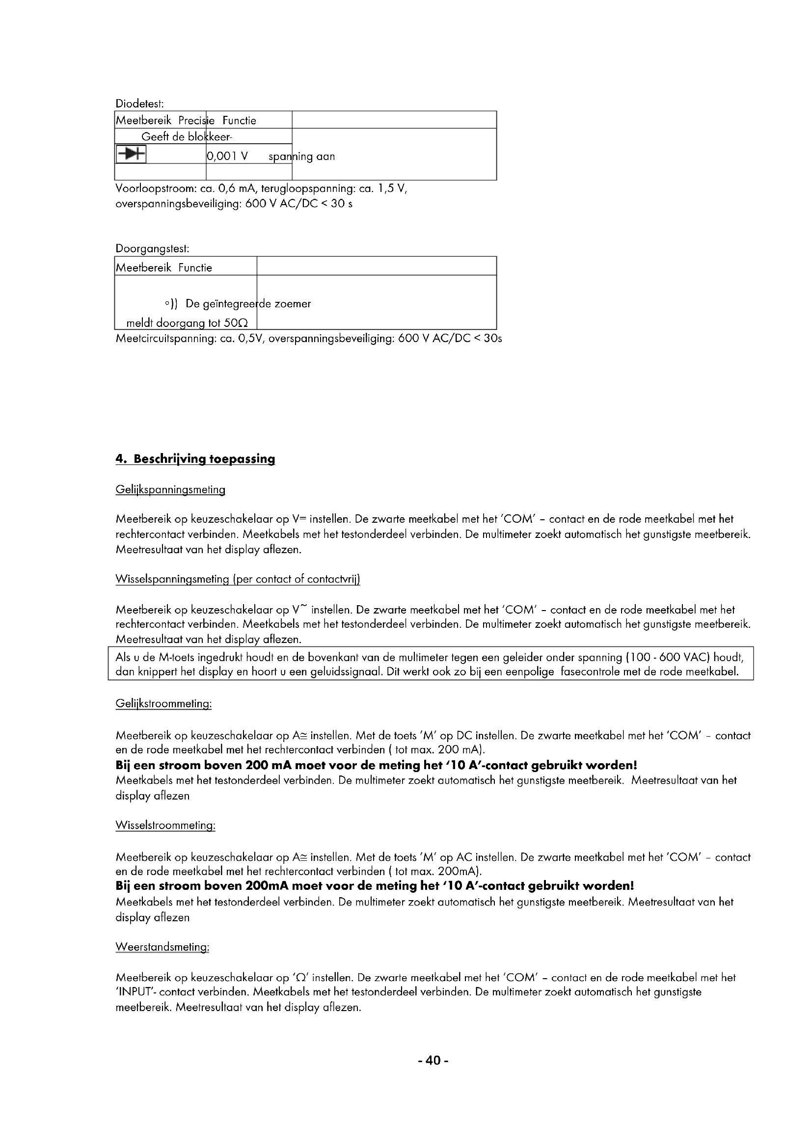 10,00 A 0,1 A ± 1,5 % v.m. + 8 digit Overbelastingsbescherming: μA- en mA-bereik beveiligd door F 200mA/690V 10 A-bereik is beveiligd door 10 A/690V Weerstand: Meetbereik Precisie Nauwkeurigheid 200 Ω 0,1 Ω overspanningsbeveiliging: 250 V AC/DC ± 1 % + 5 digit 2 kΩ 0,001 kΩ 20 kΩ 0,01 kΩ ± 1 % + 5 digit 200 kΩ 0,1 kΩ 2 MΩ 0,001 MΩ 20 MΩ 0,01 MΩ ± 1,8 % + 5 digit Meetspanning: 0,25V, overspanningsbeveiliging: 600 V AC/DC < 30s- 40 - Diodetest: Meetbereik Precisie Functie Geeft de blokkeer- 0,001 V spanning aan Voorloopstroom: ca. 0,6 mA, terugloopspanning: ca. 1,5 V, overspanningsbeveiliging: 600 V AC/DC < 30 s