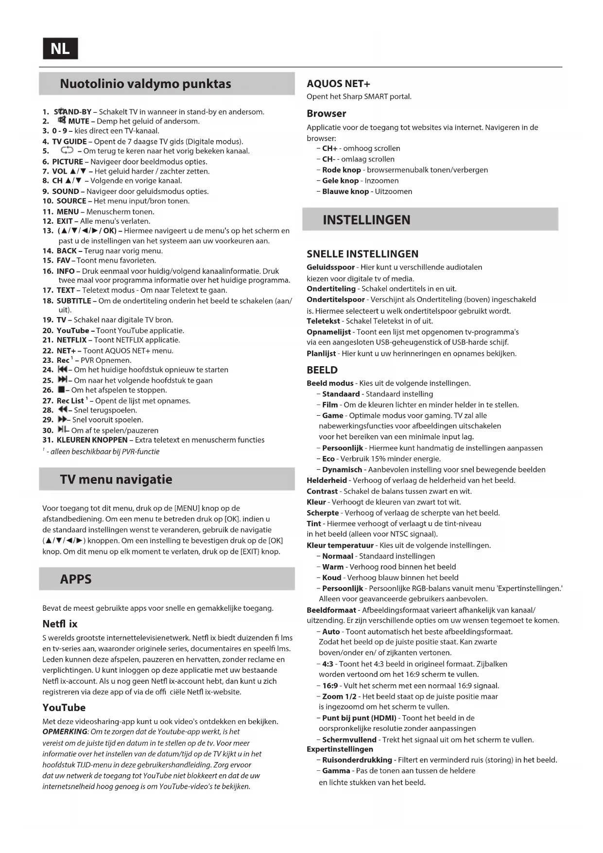 - alleen beschikbaar bij PVR-functie TV menu navigatie Voor toegang tot dit menu, druk op de [MENU] knop op de afstandbediening. Om een menu te betreden druk op [OK]. indien u de standaard instellingen wenst te veranderen, gebruik de navigatie (▲/▼/◄/►) knoppen. Om een instelling te bevestigen druk op de [OK] knop. Om dit menu op elk moment te verlaten, druk op de [EXIT} knop. APPS Bevat de meest gebruikte apps voor snelle en gemakkelijke toegang. Net ix S werelds grootste internettelevisienetwerk. Net ix biedt duizenden lms en tv-series aan, waaronder originele series, documentaires en speel lms. Leden kunnen deze afspelen, pauzeren en hervatten, zonder reclame en verplichtingen. U kunt inloggen op deze applicatie met uw bestaande Net ix-account. Als u nog geen Net ix-account hebt, dan kunt u zich registreren via deze app of via de o ciële Net ix-website. YouTube Met deze videosharing-app kunt u ook video's ontdekken en bekijken. OPMERKING: Om te zorgen dat de Youtube-app werkt, is het vereist om de juiste tijd en datum in te stellen op de tv. Voor meer informatie over het instellen van de datum/tijd op de TV kijkt u in het hoofdstuk TIJD-menu in deze gebruikershandleiding. Zorg ervoor dat uw netwerk de toegang tot YouTube niet blokkeert en dat de uw internetsnelheid hoog genoeg is om YouTube-video’s te bekijken. AQUOS NET+ Opent het Sharp SMART portal. Browser Applicatie voor de toegang tot websites via internet. Navigeren in de browser: – CH+ - omhoog scrollen – CH- - omlaag scrollen – Rode knop - browsermenubalk tonen/verbergen – Gele knop - Inzoomen – Blauwe knop - Uitzoomen INSTELLINGEN SNELLE INSTELLINGEN Geluidsspoor - Hier kunt u verschillende audiotalen kiezen voor digitale tv of media. Ondertiteling - Schakel ondertitels in en uit. Ondertitelspoor - Verschijnt als Ondertiteling (boven) ingeschakeld is. Hiermee selecteert u welk ondertitelspoor gebruikt wordt. Teletekst - Schakel Teletekst in of uit. Opnamelijst - Toont een lijst met opgenomen tv-programma's via een aangesloten USB-geheugenstick of USB-harde schijf. Planlijst - Hier kunt u uw herinneringen en opnames bekijken. BEELD Beeld modus - Kies uit de volgende instellingen. – Standaard - Standaard instelling – Film - Om de kleuren lichter en minder helder in te stellen. – Game - Optimale modus voor gaming. TV zal alle nabewerkingsfuncties voor afbeeldingen uitschakelen voor het bereiken van een minimale input lag. – Persoonlijk - Hiermee kunt handmatig de instellingen aanpassen – Eco - Verbruik 15% minder energie. – Dynamisch - Aanbevolen instelling voor snel bewegende beelden Helderheid - Verhoog of verlaag de helderheid van het beeld. Contrast - Schakel de balans tussen zwart en wit. Kleur - Verhoogt de kleuren van zwart tot wit. Scherpte - Verhoog of verlaag de scherpte van het beeld. Tint - Hiermee verhoogt of verlaagt u de tint-niveau in het beeld (alleen voor NTSC signaal). Kleur temperatuur - Kies uit de volgende instellingen. – Normaal - Standaard instellingen – Warm - Verhoog rood binnen het beeld – Koud - Verhoog blauw binnen het beeld – Persoonlijk - Persoonlijke RGB-balans vanuit menu 'Expertinstellingen.' Alleen voor geavanceerde gebruikers aanbevolen. Beeldformaat - Afbeeldingsformaat varieert afhankelijk van kanaal/ uitzending. Er zijn verschillende opties om uw wensen tegemoet te komen. – Auto - Toont automatisch het beste afbeeldingsformaat. Zodat het beeld op de juiste positie staat. Kan zwarte boven/onder en/ of zijkanten vertonen. – 4:3 - Toont het 4:3 beeld in origineel formaat. Zijbalken worden vertoond om het 16:9 scherm te vullen. – 16:9 - Vult het scherm met een normaal 16:9 signaal. – Zoom 1/2 - Het beeld staat op de juiste positie maar is ingezoomd om het scherm te vullen. – Punt bij punt (HDMI) - Toont het beeld in de oorspronkelijke resolutie zonder aanpassingen – Schermvullend - Trekt het signaal uit om het scherm te vullen. Expertinstellingen – Ruisonderdrukking - Filtert en verminderd ruis (storing) in het beeld. – Gamma - Pas de tonen aan tussen de heldere en lichte stukken van het beeld.33 – Actief contrast - Optimaliseert automatisch 'backlight' en 'contrast' van het beeld in afhankelijk van de helderheid van het scherm. – Achtergrondverlichting - Pas de helderheid van het scherm aan door de backlight van het scherm te verhogen/verlagen. – Rood - Pas de roodtonen aan van het beeld. – Groen - Pas de groentonen aan van het beeld. – Blauw - Pas de blauwtonen aan van het beeld. – CMS Hue - Hiermee kunnen de kleuren roder of blauwer van toon worden gemaakt. – CMS Value - Een hogere waarde maakt het beeld helderder. Een lagere waarde maakt het beeld donkerder. – CMS Saturation - Verhoogt of verlaagt de verzadiging van een geselecteerde kleur. GELUID Geluidsmodus - Kies uit de volgende instellingen – Standaard - Standaard instellingen – Muziek - Benadrukt muziek over stemmen – Film - Geeft een live en vol geluid voor lms – Sport - benadrukt geluiden voor sport – Persoonlijk - Kies uw persoonlijke instellingen DTS Studio Sound - Hiermee zet u het surround sound e ect AAN of UIT. DTS DRC - Om het niveau van het dynamisch bereik van DTS- lmsoundtracks in te stellen. Zeer harde geluiden worden stiller en zachte delen worden luider. Aanbevolen voor middernacht. Luidspreker - Aanvullende instellingen voor TV- luidsprekers of externe luidsprekers. – Digitale uitgang - Instellingen voor de digitale audio-uitgang. Kies uit de volgende opties: – Auto - Selecteert automatisch de beste instellingen. – PCM - Audiostream wordt verwerkt door de tv. – RAW - Audiostream wordt verwerkt door het apparaat dat via de digitale uitgang is aangesloten (soundbar, AV-ontvanger, etc.). SPDIF vertraging (ms) - Hiermee kan de gebruiker de geluidsinstelling aanpassen om het beeld en audio voor externe speakers verbonden via digitale audio uitgang te synchroniseren. Audio vertraging (ms) - Hiermee kan de gebruiker de geluidsinstelling