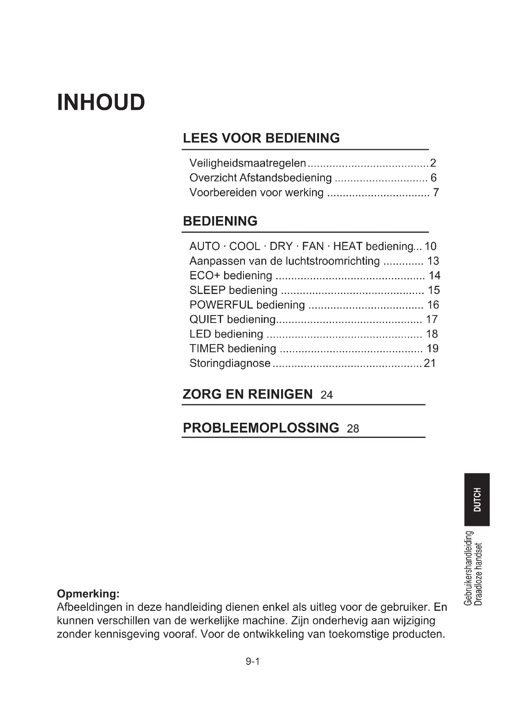 - Zorg er na reiniging voor dat het voorpaneel weer stevig vastzit. Wanneer de unit niet zal worden gebruikt gedurende een lange tijd Bedien de unit gedurende 2 uur met de volgende instelling.Bedieningsmodus: koel Temperatuur: 30°C/86°FVerwijder de stekkerWanneer u een apart stroomcircuit gebruikt voor uw unit, onderbreek dan het circuit.Verwijder de batterijen uit de afstandsbediening.9-28 PROBLEEMOPLOSSING Neem voor vragen over reserveonderdelen contact op met uw geautoriseerde dealer. Wanneer een storing aan de airconditioner unit wordt opgemerkt, schakel dan onmiddellijk de stroomtoevoer naar de unit uit. Controleer de volgende storingen en oorzaken voor een paar eenvoudige tips voor probleemoplossing. Storing Oorzaken/actie