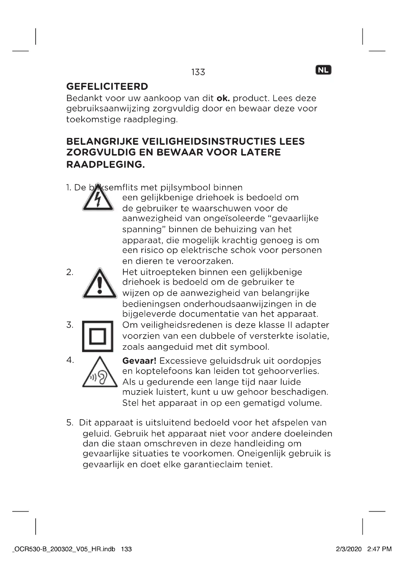 geluid. Gebruik het apparaat niet voor andere doeleinden dan die staan omschreven in deze handleiding om gevaarlijke situaties te voorkomen. Oneigenlijk gebruik is gevaarlijk en doet elke garantieclaim teniet. IM_OCR530-B_200302_V05_HR.indb 133IM_OCR530-B_200302_V05_HR.indb 133 2/3/2020 2:47 PM2/3/2020 2:47 PM134 Size - A6