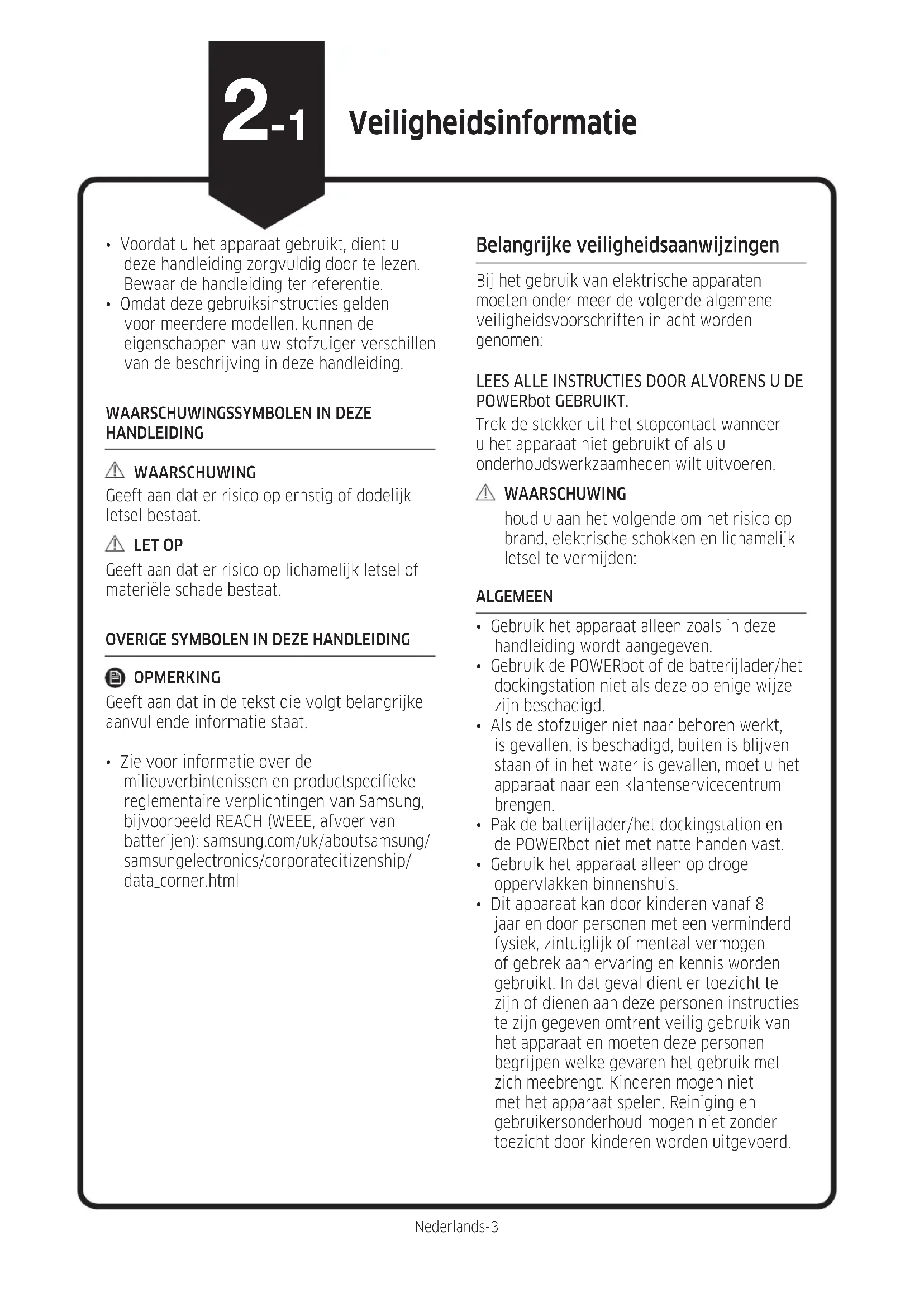 - Zie voor informatie over de milieuverbintenissen en productspecieke reglementaire verplichtingen van Samsung, bijvoorbeeld REACH (WEEE, afvoer van batterijen): samsung.com/uk/aboutsamsung/ samsungelectronics/corporatecitizenship/ data_corner.html Belangrijke veiligheidsaanwijzingen Bij het gebruik van elektrische apparaten moeten onder meer de volgende algemene veiligheidsvoorschriften in acht worden genomen: LEES ALLE INSTRUCTIES DOOR ALVORENS U DE POWERbot GEBRUIKT. Trek de stekker uit het stopcontact wanneer u het apparaat niet gebruikt of als u onderhoudswerkzaamheden wilt uitvoeren. WAARSCHUWING houd u aan het volgende om het risico op brand, elektrische schokken en lichamelijk letsel te vermijden: ALGEMEEN