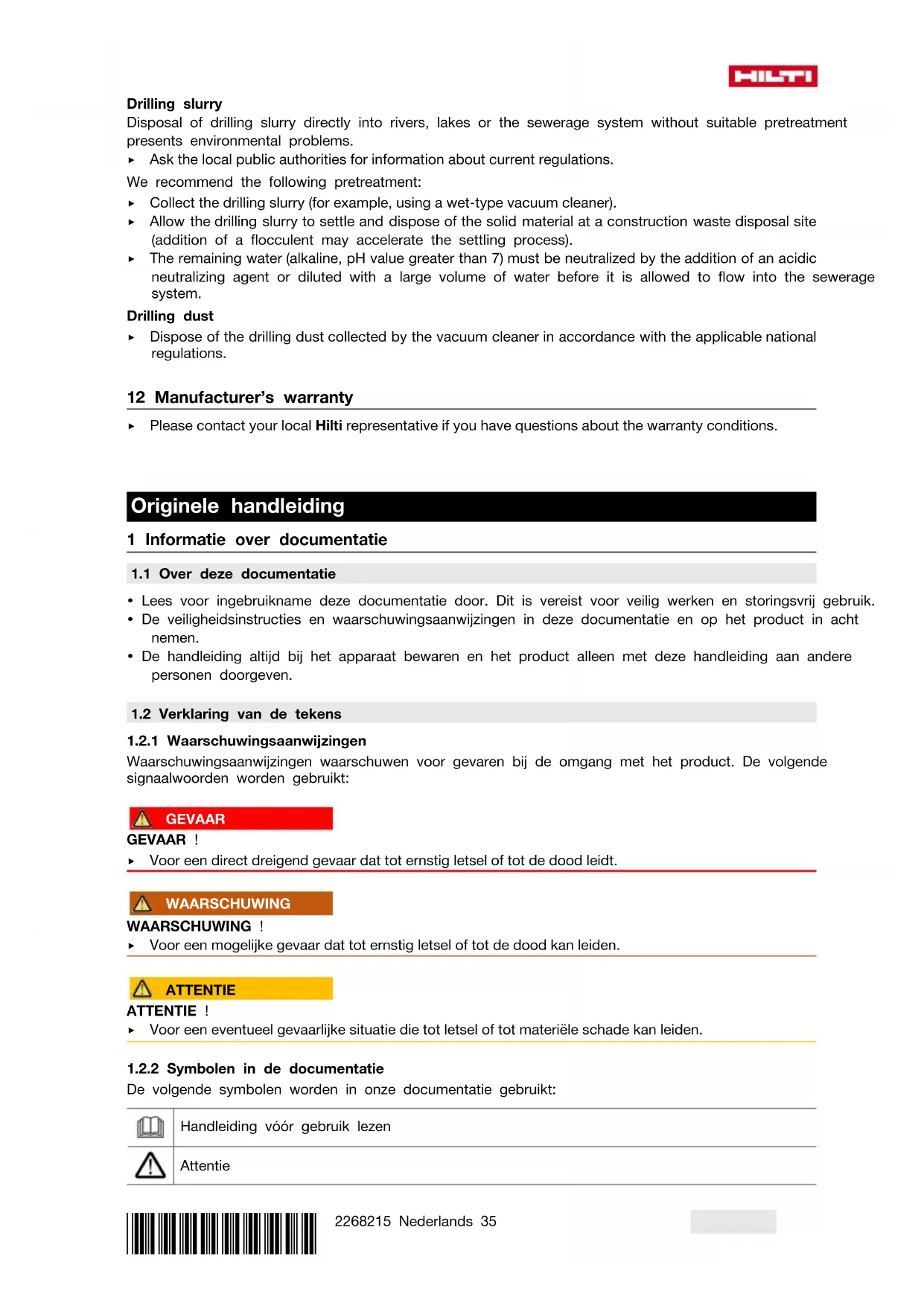 - Pagina 46. 11 Recycling Hilti producten zijn voor een groot deel vervaardigd uit materialen die kunnen worden gerecycled. Voor recycling is een juiste materiaalscheiding noodzakelijk. In een groot aantal landen neemt Hilti uw oude apparaat voor recycling terug. Vraag hiernaar bij de klantenservice vanHilti of bij uw verkoopadviseur. Overeenkomstig de Europese richtlijn inzake oude elektrische en elektronische apparaten en de toepassing daarvan binnen de nationale wetgeving, dient gebruikt elektrisch gereedschap gescheiden te worden ingezameld en te worden afgevoerd naar een recyclingbedrijf dat voldoet aan de geldende milieu-eisen. ▶ Geef elektrische apparaten niet met het huisvuil mee!52 Français 2268215 *2268215* Boorslib Vanuit milieuoogpunt is het afvoeren van boorgruis in water of in de riolering zonder juiste voorbehandeling problematisch. ▶ Informeer bij de lokale instanties naar de bestaande voorschriften. Wij bevelen de volgende voorbehandeling aan: ▶ Verzamel het boorslib (bijvoorbeeld met de natzuiger). ▶ Laat het boorslib neerslaan en breng het vaste materiaal naar een vuilstortplaats voor bouwafval (uitvlokkingsmiddelen kunnen het afscheidingsproces versnellen). ▶ Voor u het resterende water (basisch, pH waarde > 7) afvoert in de riolering, neutraliseert u dit door een zuur neutralisatiemiddel toe te voegen of door het met veel water te verdunnen. Boorstof ▶ Voer verzamelde boorstof af volgens de geldende nationale, wettelijke voorschriften. 12 Fabrieksgarantie ▶ Neem bij vragen over de garantievoorwaarden contact op met uw lokale Hilti dealer. Notice d'utilisation originale 1 Indications relatives à la documentation