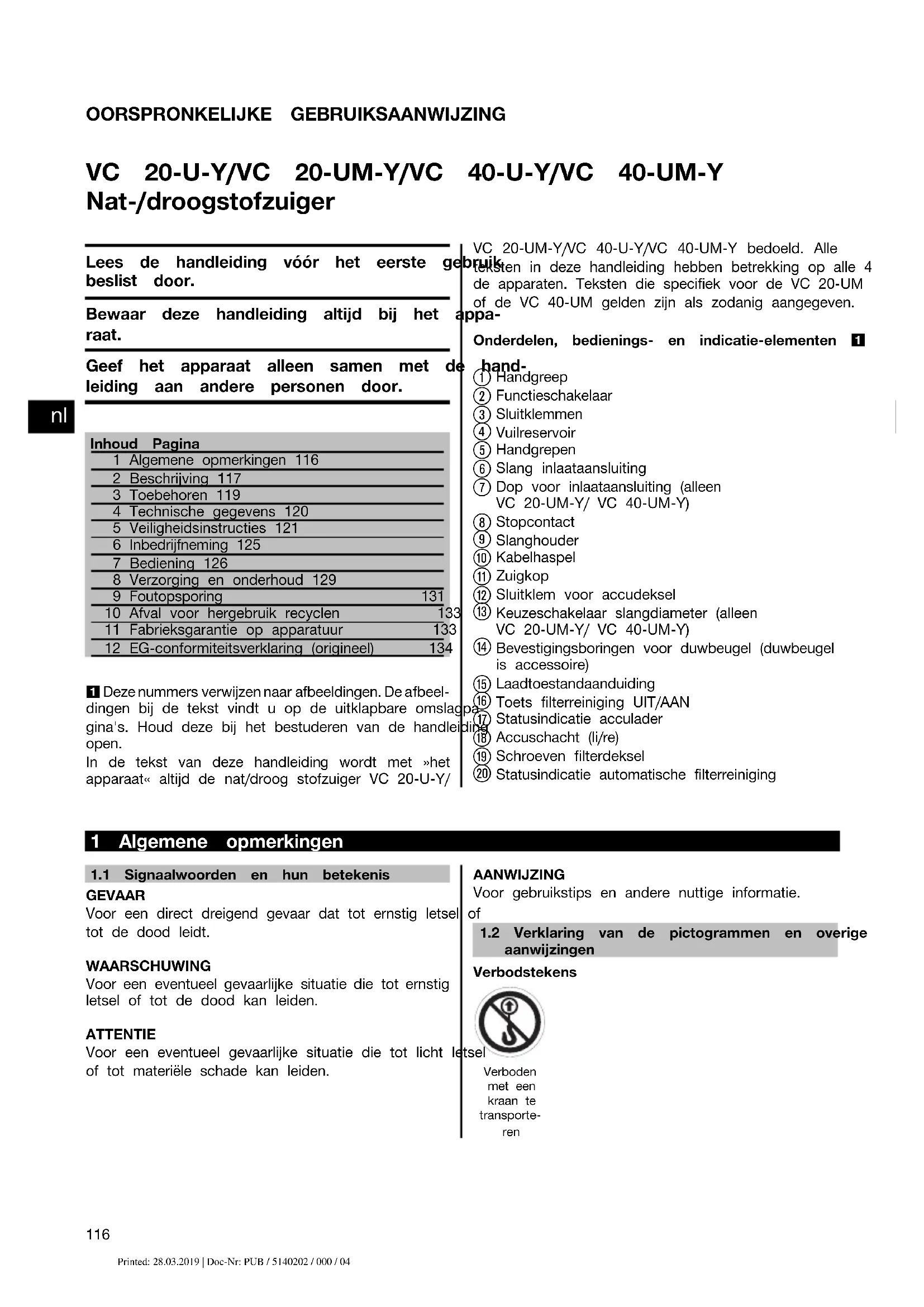 Printed: 24.03.2014 | Doc-Nr: PUB / 5140202 / 000 / 03 Printed: 28.03.2019 | Doc-Nr: PUB / 5140202 / 000 / 04OORSPRONKELIJKE GEBRUIKSAANWIJZING VC 20-U‑Y/VC 20-UM‑Y/VC 40-U‑Y/VC 40-UM‑Y Nat‑/droogstofzuiger Lees de handleiding vóór het eerste gebruik beslist door. Bewaar deze handleiding altijd bij het appa- raat. Geef het apparaat alleen samen met de hand- leiding aan andere personen door. Inhoud Pagina1 Algemene opmerkingen 1162 Beschrijving 1173 Toebehoren 1194 Technische gegevens 1205 Veiligheidsinstructies 1216 Inbedrijfneming 1257 Bediening 1268 Verzorging en onderhoud 1299 Foutopsporing 13110 Afval voor hergebruik recyclen 13311 Fabrieksgarantie op apparatuur 13312 EG-conformiteitsverklaring (origineel) 134 1 Deze nummers verwijzen naar afbeeldingen. De afbeel- dingen bij de tekst vindt u op de uitklapbare omslagpa-gina's. Houd deze bij het bestuderen van de handleidingopen. In de tekst van deze handleiding wordt met »het apparaat« altijd de nat/droog stofzuiger VC 20‑U‑Y/ VC 20‑UM‑Y/VC 40‑U‑Y/VC 40‑UM‑Y bedoeld. Alle teksten in deze handleiding hebben betrekking op alle 4de apparaten. Teksten die specifiek voor de VC 20‑UMof de VC 40‑UM gelden zijn als zodanig aangegeven.Onderdelen, bedienings- en indicatie-elementen 1 Handgreep Functieschakelaar Sluitklemmen Vuilreservoir Handgrepen Slang inlaataansluiting Dop voor inlaataansluiting (alleenVC 20‑UM‑Y/ VC 40‑UM‑Y) Stopcontact Slanghouder Kabelhaspel Zuigkop Sluitklem voor accudeksel Keuzeschakelaar slangdiameter (alleenVC 20‑UM‑Y/ VC 40‑UM‑Y) Bevestigingsboringen voor duwbeugel (duwbeugelis accessoire) Laadtoestandaanduiding Toets filterreiniging UIT/AAN Statusindicatie acculader Accuschacht (li/re) Schroeven filterdeksel Statusindicatie automatische filterreiniging 1 Algemene opmerkingen 1.1 Signaalwoorden en hun betekenisGEVAARVoor een direct dreigend gevaar dat tot ernstig letsel oftot de dood leidt.WAARSCHUWING Voor een eventueel gevaarlijke situatie die tot ernstig letsel of tot de dood kan leiden.ATTENTIEVoor een eventueel gevaarlijke situatie die tot licht letselof tot materiële schade kan leiden.AANWIJZINGVoor gebruikstips en andere nuttige informatie.1.2 Verklaring van de pictogrammen en overigeaanwijzingenVerbodstekensVerbodenmet eenkraan tetransporte- ren