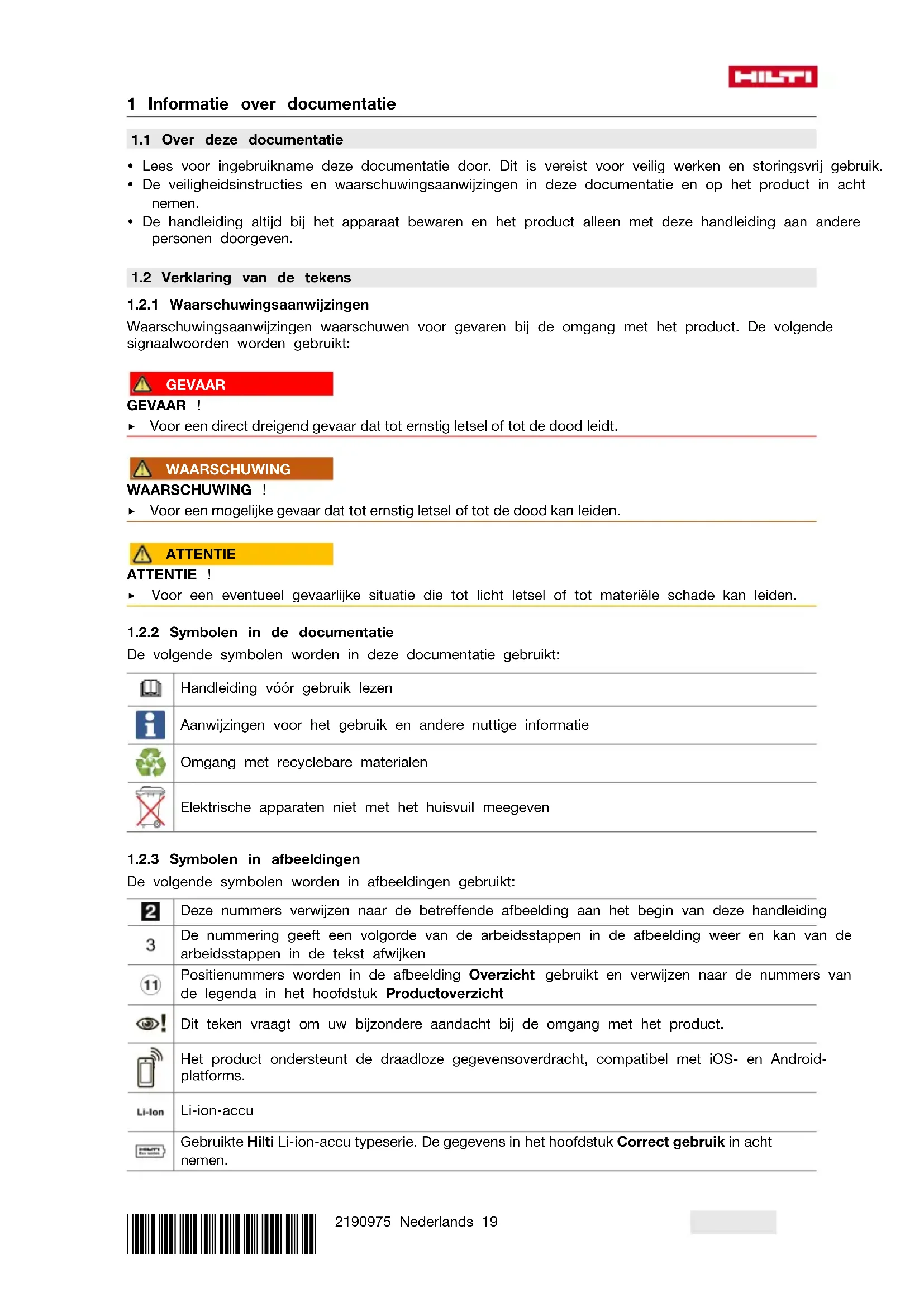 De volgende symbolen worden in afbeeldingen gebruikt: Deze nummers verwijzen naar de betreffende afbeelding aan het begin van deze handleiding De nummering geeft een volgorde van de arbeidsstappen in de afbeelding weer en kan van de arbeidsstappen in de tekst afwijken Positienummers worden in de afbeelding Overzicht gebruikt en verwijzen naar de nummers van de legenda in het hoofdstuk Productoverzicht Dit teken vraagt om uw bijzondere aandacht bij de omgang met het product. Het product ondersteunt de draadloze gegevensoverdracht, compatibel met iOS- en Android- platforms. Liion-accu Gebruikte Hilti Li-ion-accu typeserie. De gegevens in het hoofdstuk Correct gebruik in acht nemen.20 Nederlands 2190975 *2190975* Gebruik de accu nooit als hamer. Laat de accu niet vallen. Gebruik geen accu die een klap gekregen heeft of anderszins bescha- digd is.