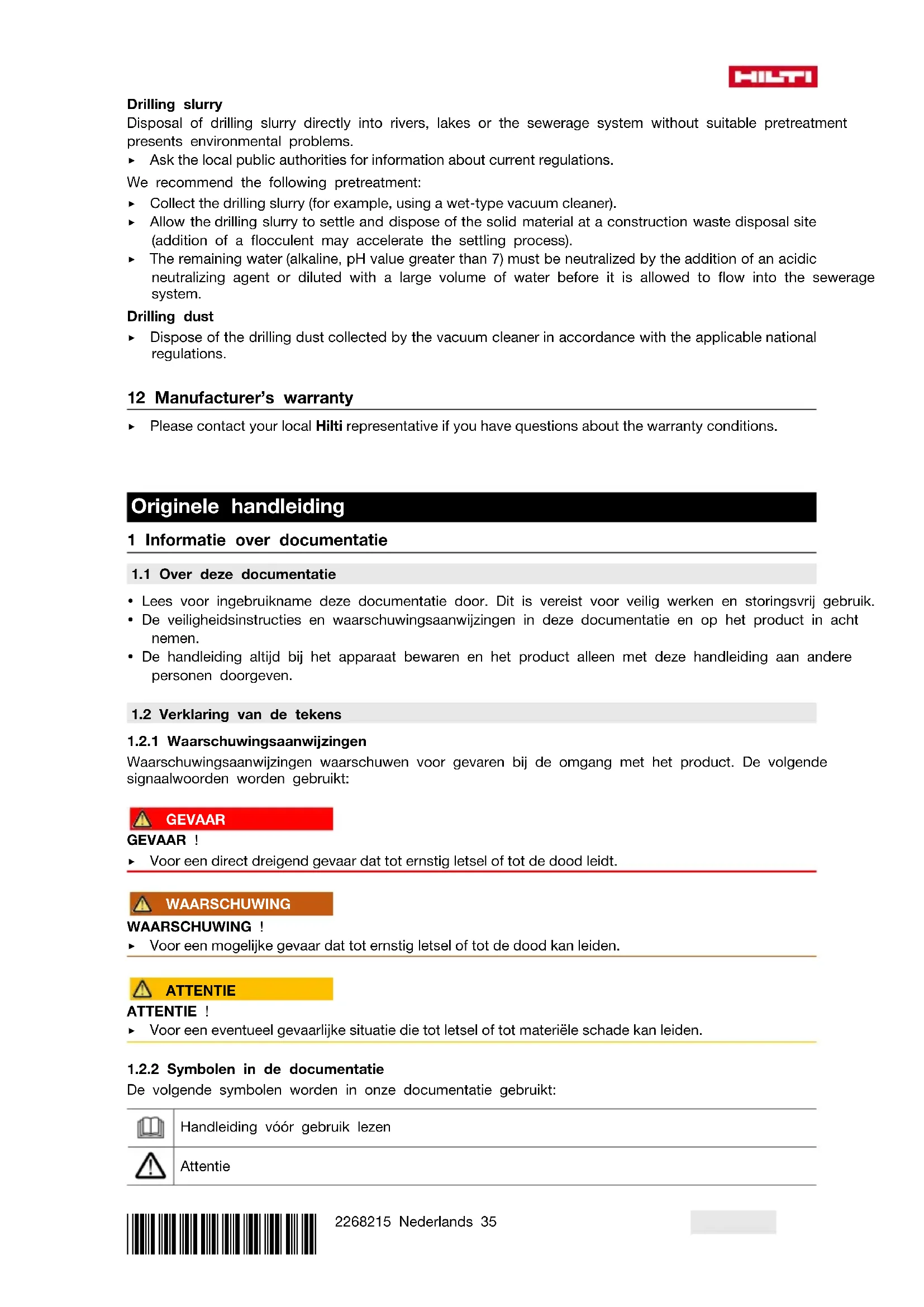 - Pagina 46. 11 Recycling Hilti producten zijn voor een groot deel vervaardigd uit materialen die kunnen worden gerecycled. Voor recycling is een juiste materiaalscheiding noodzakelijk. In een groot aantal landen neemt Hilti uw oude apparaat voor recycling terug. Vraag hiernaar bij de klantenservice vanHilti of bij uw verkoopadviseur. Overeenkomstig de Europese richtlijn inzake oude elektrische en elektronische apparaten en de toepassing daarvan binnen de nationale wetgeving, dient gebruikt elektrisch gereedschap gescheiden te worden ingezameld en te worden afgevoerd naar een recyclingbedrijf dat voldoet aan de geldende milieu-eisen. ▶ Geef elektrische apparaten niet met het huisvuil mee!52 Français 2268215 *2268215* Boorslib Vanuit milieuoogpunt is het afvoeren van boorgruis in water of in de riolering zonder juiste voorbehandeling problematisch. ▶ Informeer bij de lokale instanties naar de bestaande voorschriften. Wij bevelen de volgende voorbehandeling aan: ▶ Verzamel het boorslib (bijvoorbeeld met de natzuiger). ▶ Laat het boorslib neerslaan en breng het vaste materiaal naar een vuilstortplaats voor bouwafval (uitvlokkingsmiddelen kunnen het afscheidingsproces versnellen). ▶ Voor u het resterende water (basisch, pH waarde > 7) afvoert in de riolering, neutraliseert u dit door een zuur neutralisatiemiddel toe te voegen of door het met veel water te verdunnen. Boorstof ▶ Voer verzamelde boorstof af volgens de geldende nationale, wettelijke voorschriften. 12 Fabrieksgarantie ▶ Neem bij vragen over de garantievoorwaarden contact op met uw lokale Hilti dealer. Notice d'utilisation originale 1 Indications relatives à la documentation
