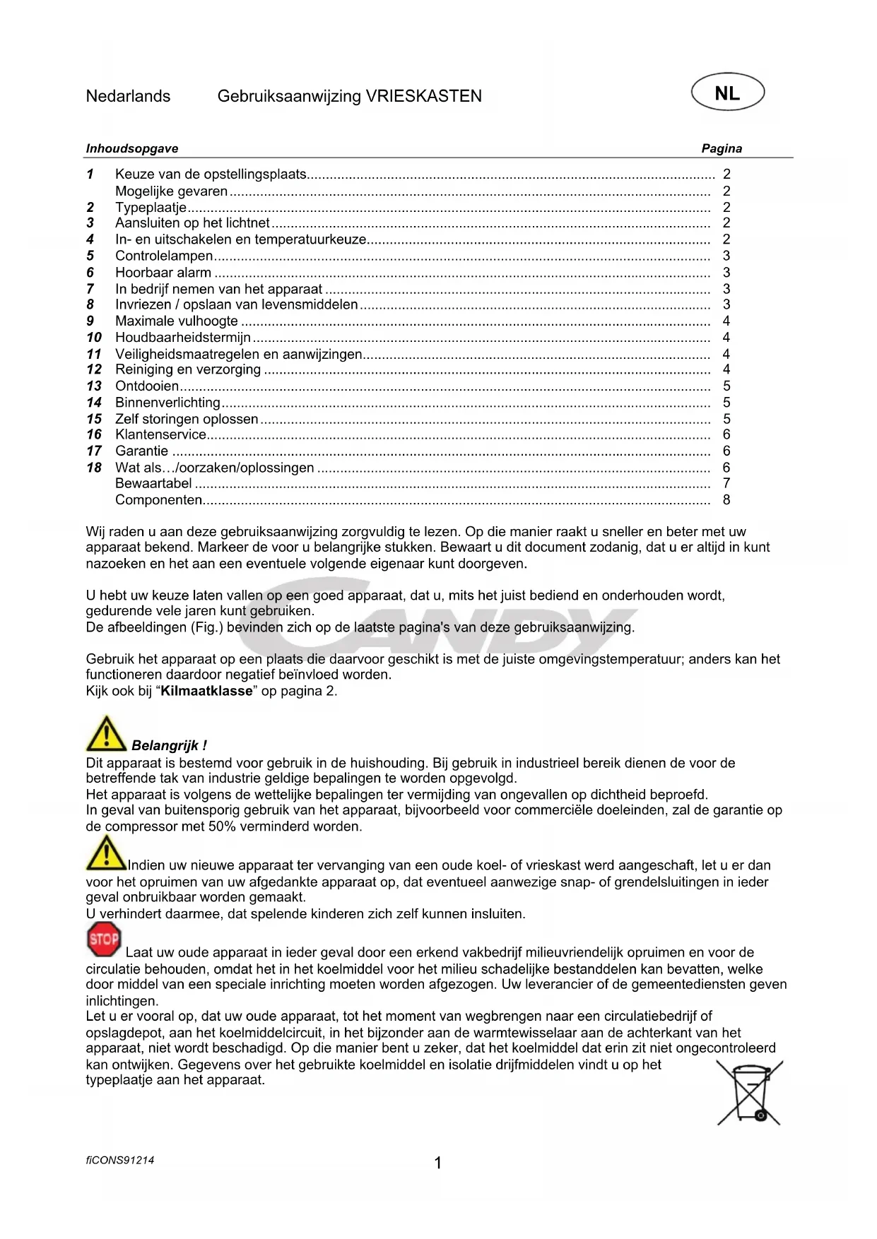- Componenten Wij raden u aan deze gebruiksaanwijzing zorgvuldig te lezen. Op die manier raakt u sneller en beter met uw apparaat bekend. Markeer de voor u belangrijke stukken. Bewaart u dit document zodanig, dat u er altijd in kunt nazoeken en het aan een eventuele volgende eigenaar kunt doorgeven. U hebt uw keuze laten vallen op een goed apparaat, dat u, mits het juist bediend en onderhouden wordt, gedurende vele jaren kunt gebruiken. De afbeeldingen (Fig.) bevinden zich op de laatste pagina's van deze gebruiksaanwijzing. Gebruik het apparaat op een plaats die daarvoor geschikt is met de juiste omgevingstemperatuur; anders kan het functioneren daardoor negatief beïnvloed worden. Kijk ook bij “Kilmaatklasse” op pagina 2. Belangrijk ! Dit apparaat is bestemd voor gebruik in de huishouding. Bij gebruik in industrieel bereik dienen de voor de betreffende tak van industrie geldige bepalingen te worden opgevolgd. Het apparaat is volgens de wettelijke bepalingen ter vermijding van ongevallen op dichtheid beproefd. In geval van buitensporig gebruik van het apparaat, bijvoorbeeld voor commerciële doeleinden, zal de garantie op de compressor met 50% verminderd worden. Indien uw nieuwe apparaat ter vervanging van een oude koel- of vrieskast werd aangeschaft, let u er dan voor het opruimen van uw afgedankte apparaat op, dat eventueel aanwezige snap- of grendelsluitingen in ieder geval onbruikbaar worden gemaakt. U verhindert daarmee, dat spelende kinderen zich zelf kunnen insluiten. Laat uw oude apparaat in ieder geval door een erkend vakbedrijf milieuvriendelijk opruimen en voor de circulatie behouden, omdat het in het koelmiddel voor het milieu schadelijke bestanddelen kan bevatten, welke door middel van een speciale inrichting moeten worden afgezogen. Uw leverancier of de gemeentediensten geven inlichtingen. Let u er vooral op, dat uw oude apparaat, tot het moment van wegbrengen naar een circulatiebedrijf of opslagdepot, aan het koelmiddelcircuit, in het bijzonder aan de warmtewisselaar aan de achterkant van het apparaat, niet wordt beschadigd. Op die manier bent u zeker, dat het koelmiddel dat erin zit niet ongecontroleerd kan ontwijken. Gegevens over het gebruikte koelmiddel en isolatie drijfmiddelen vindt u op het typeplaatje aan het apparaat.Nedarlands Gebruiksaanwijzing VRIESKASTEN fiCINS91214 p. 8