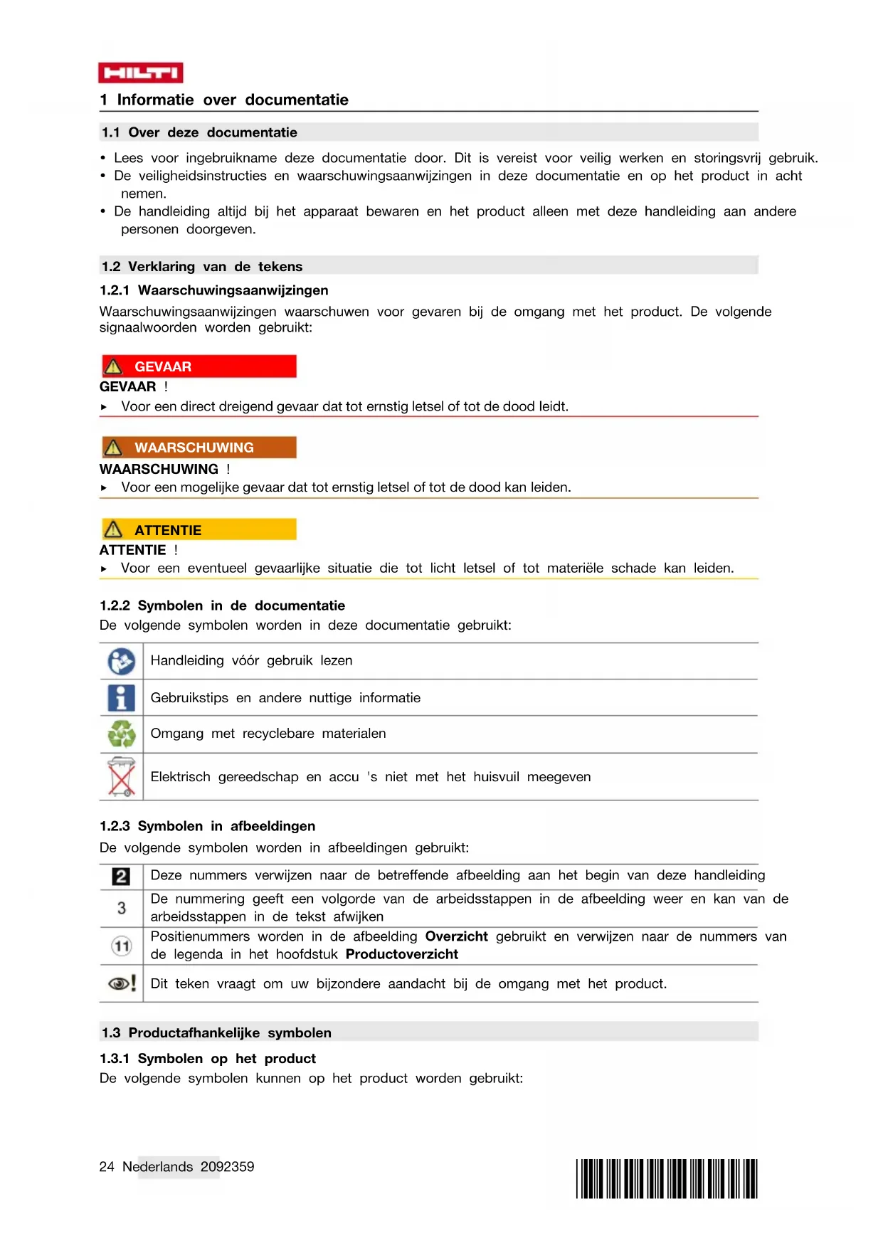 Neem bij vragen over de garantievoorwaarden contact op met uw lokale Hilti dealer.36 Français 2092359 *2092359* 1 Indications relatives à la documentation
