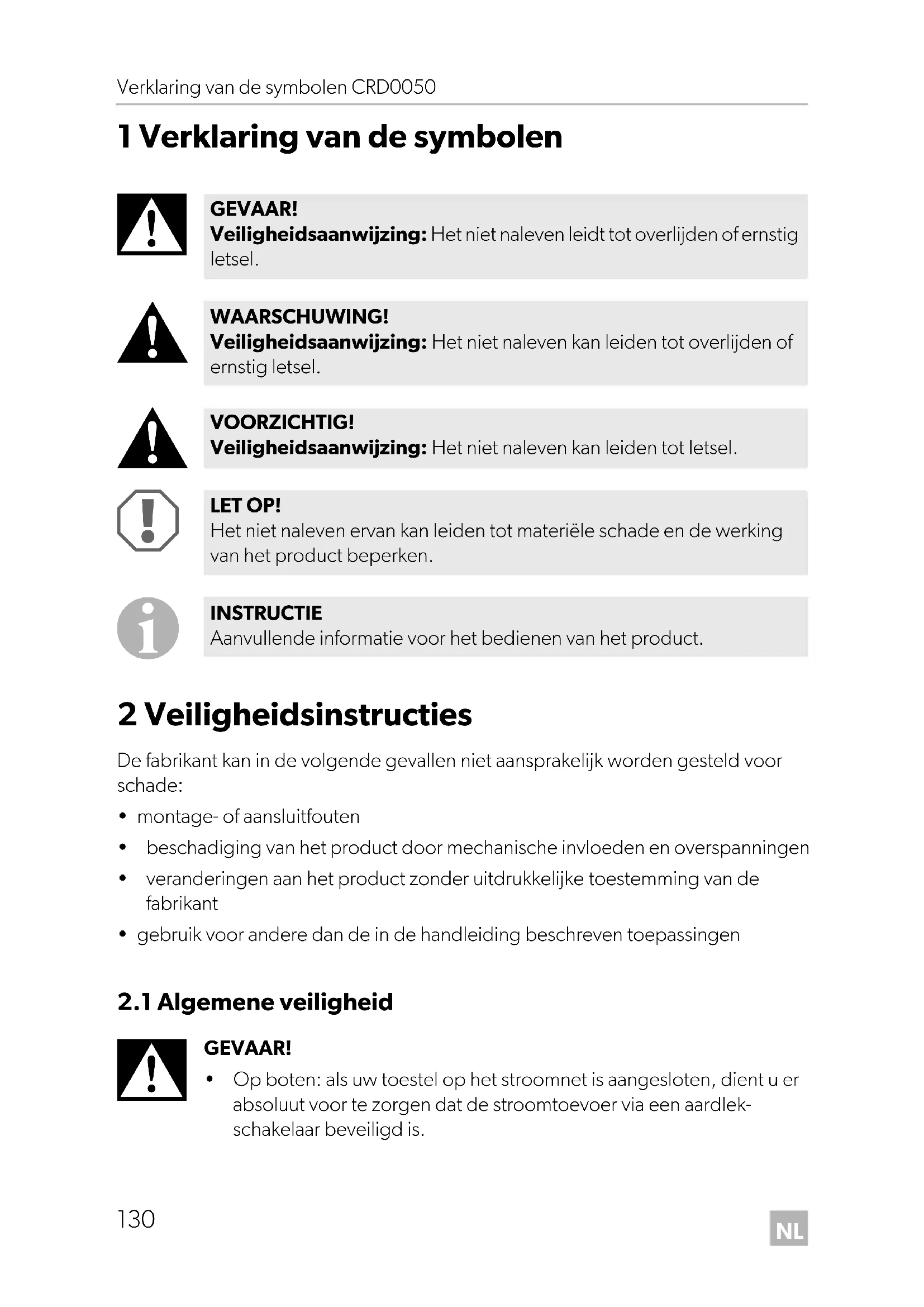 - Op boten: als uw toestel op het stroomnet is aangesloten, dient u er absoluut voor te zorgen dat de stroomtoevoer via een aardlek- schakelaar beveiligd is. GEVAAR! Veiligheidsaanwijzing: Het niet naleven leidt tot overlijden of ernstig letsel. WAARSCHUWING! Veiligheidsaanwijzing: Het niet naleven kan leiden tot overlijden of ernstig letsel. VOORZICHTIG! Veiligheidsaanwijzing: Het niet naleven kan leiden tot letsel. LET OP! Het niet naleven ervan kan leiden tot materiële schade en de werking van het product beperken. INSTRUCTIE Aanvullende informatie voor het bedienen van het product. CRD0050--IO-16s.book Seite 130 Mittwoch, 16. August 2017 10:30 10NL CRD0050 Veiligheidsinstructies