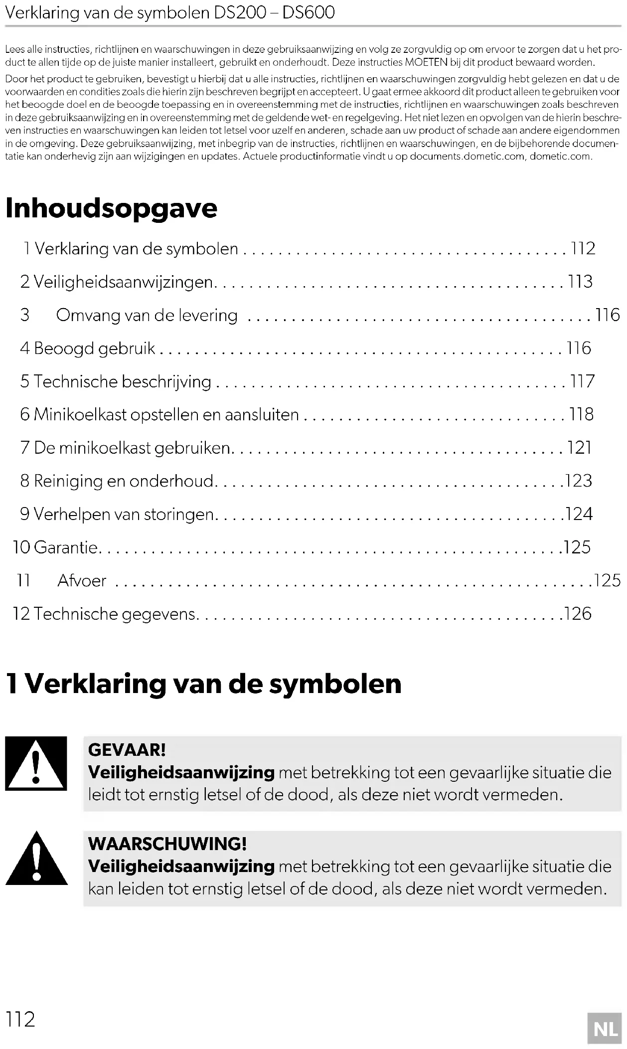 - Bewaar geen explosiegevaarlijke stoffen, zoals spuitbussen met brandbaar drijfgas, in de minikoelkast. VOORZICHTIG! Veiligheidsaanwijzing met betrekking tot een gevaarlijke situatie die kan leiden tot licht of gemiddeld letsel, als deze niet wordt vermeden. LET OP! Aanwijzing met betrekking tot een situatie die kan leiden tot materiële schade, als deze niet wordt vermeden. INSTRUCTIE Meer informatie over de bediening van het product. DometicDS200-300-400-600_IOM_4445103315_EMEA16_2020-xx-xx.book Seite 113 Mittwoch, 3. März 2021 11:36 11NL Veiligheidsaanwijzingen DS200 – DS600