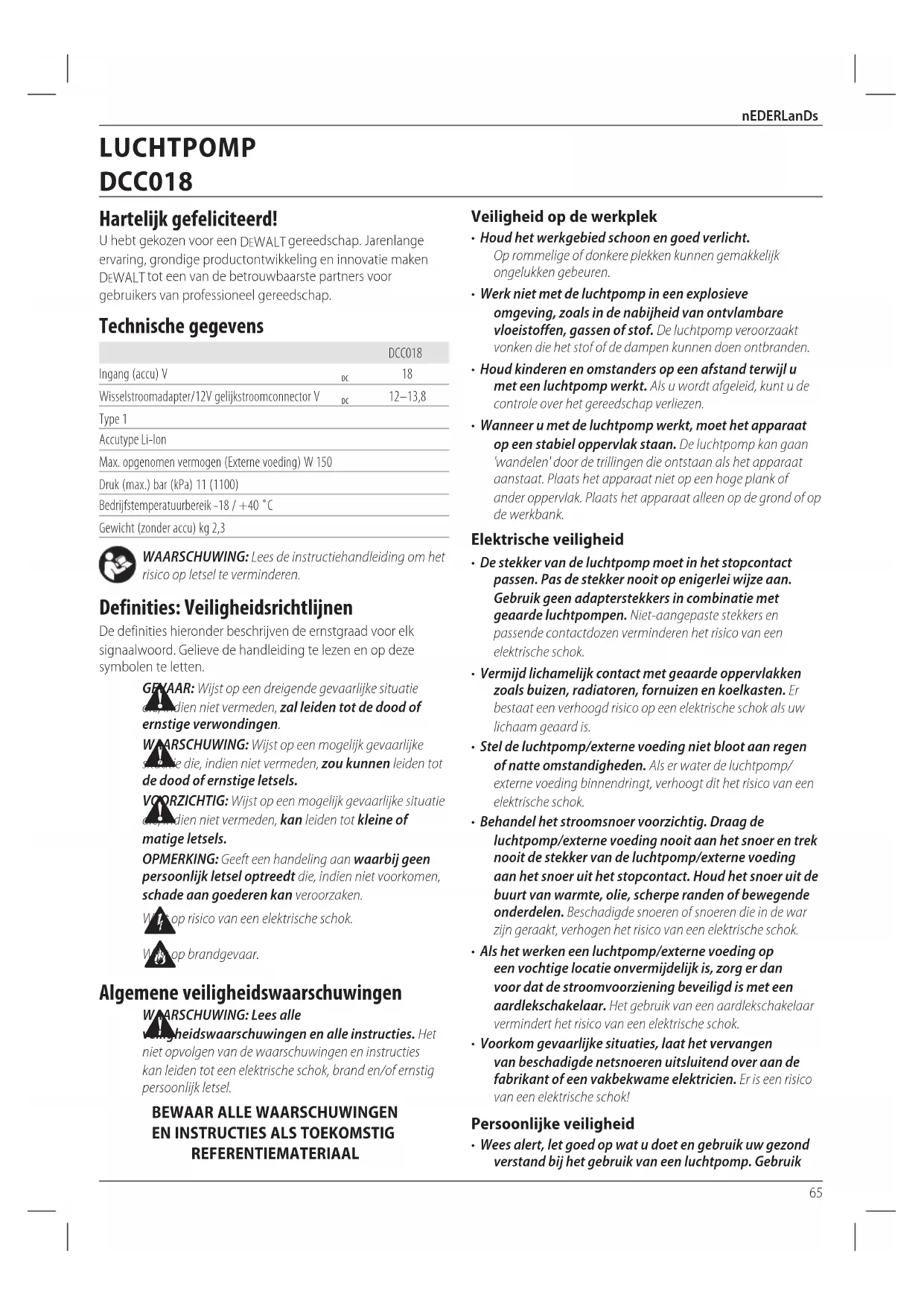 DeWALT -luchtpomp is ontworpen voor snoerloos gebruik, in de meeste voertuigen, via de standaard 12V DC-aansluiting of met de externe voeding van 13,8V van DeWALT voor het oppompen van banden van auto's en fietsen, ballen, vlotten, luchtbedden en drijfkussens in het zwembad, enz. Dit product is uitsluitend bedoeld voor professioneelgebruik. GEBRUIk ZE nIET bij natte omstandigheden of in de aanwezigheid van ontvlambare vloeistoffen ofgassen. Werk nIET met de compressor in een ruimte waar u verfspuit. Deze luchtpomp is professioneel elektrisch gereedschap. LaaT GEEn kinderen in contact met het gereedschap komen. Toezicht is vereist als onervaren gebruikers dit gereedschapbedienen.